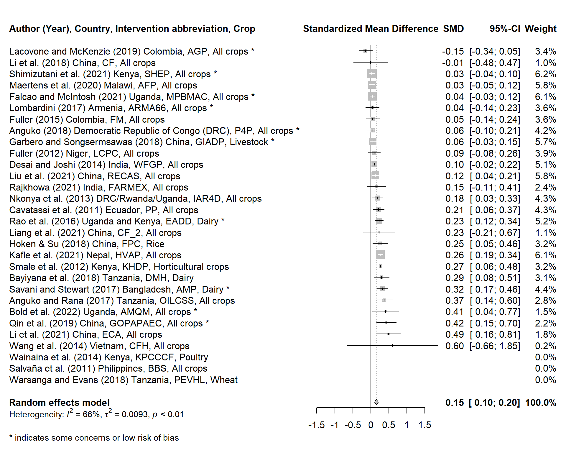 resoutcomesubcode_meta <-metagen(TE = yi, seTE =sqrt(vi), data = current_data, sm ="SMD",fixed = F,random = T,method.tau ="DL",studlab = authors_ctry_rob_inter)forest.meta(resoutcomesubcode_meta,sortvar = TE,leftcols =c("studlab"),leftlabs =c("Author (Year), Country, Intervention abbreviation, Crop "),weight.study ="common",digits.TE =2,smlab ="Standardized Mean Difference", # This commend specifies the display option whether Us or UK English sytle.text.addline2 =format("\n\n* indicates some concerns or low risk of bias"))
