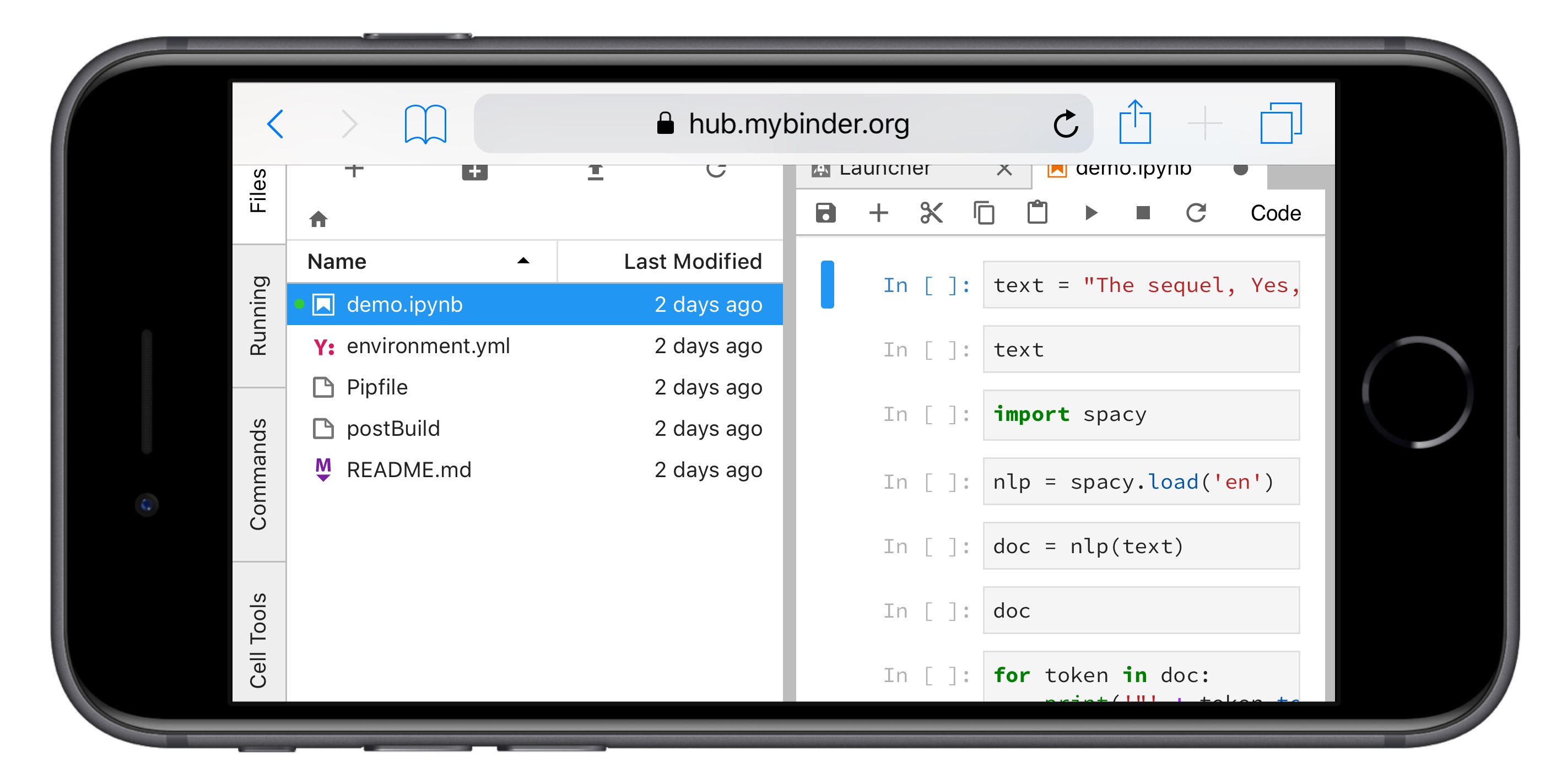 https://mybinder.org/v2/gh/wshuyi/demo-spacy-text-processing/master?urlpath=lab/tree/demo.ipynb