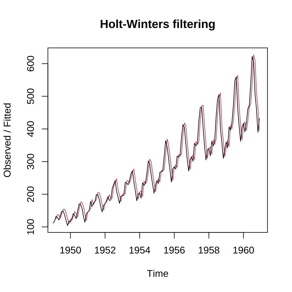 HoltWinters(x = AirPassengers, seasonal = "additive")