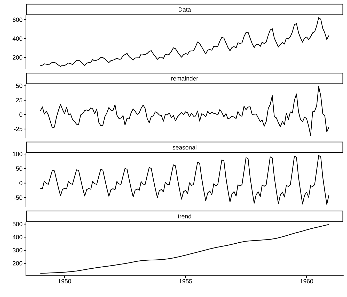 函数 stl() 将时间序列分解为趋势性成分、季节性成分(周期性)、剩余成分。