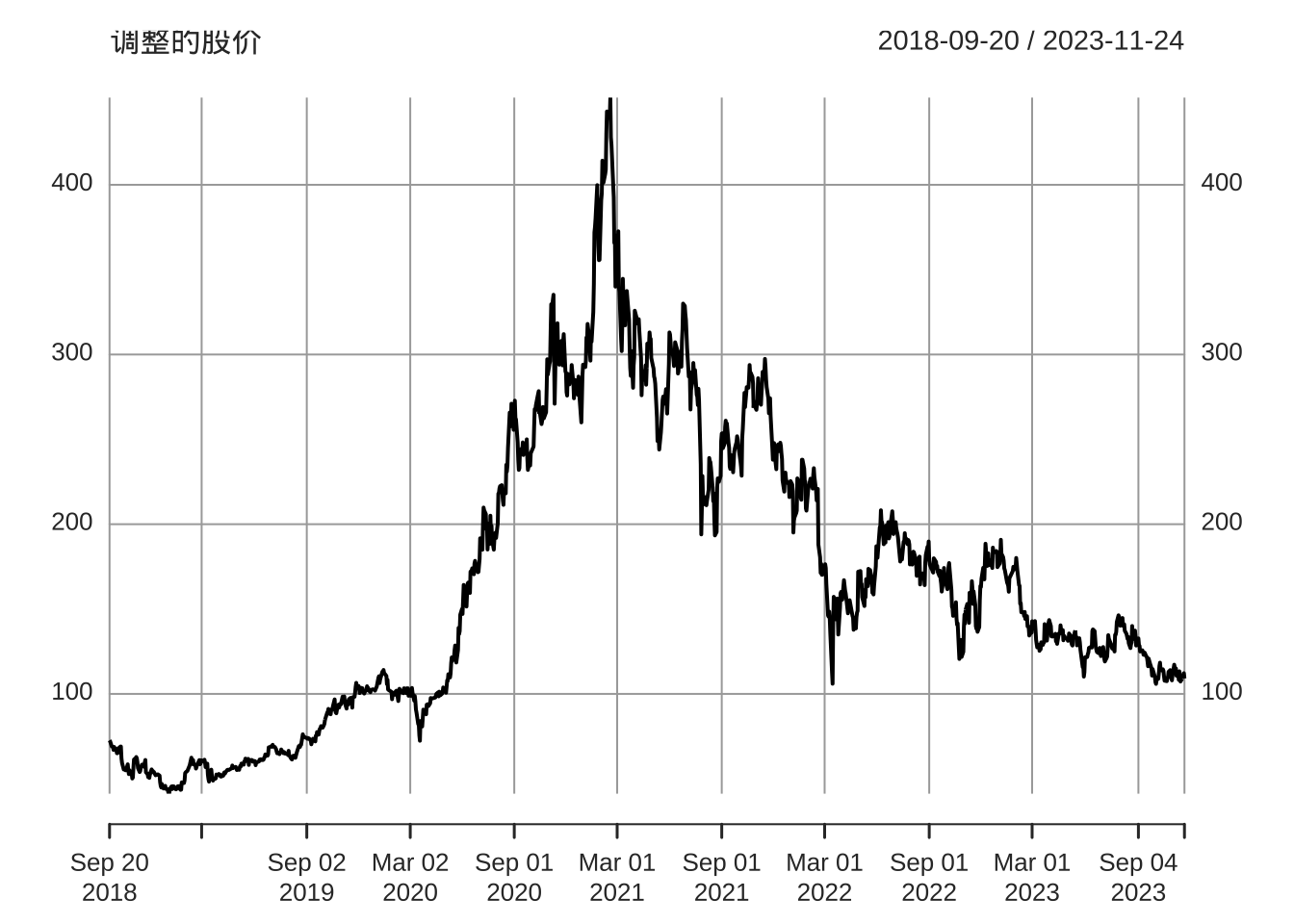 Joshua M. Ulrich 开发维护的 quantmod 包可以下载国内外股票市场的数据。本节主要以美团股价数据为例,美团自 2018-09-20 在香港挂牌上市,股票代码 3690.HK。首先用 quantmod 包 (Ryan 和 Ulrich 2022) 获取美团上市至 2023-11-24 每天的股价数据,包含 Open 开盘价、High 最高价、Low 最低价、Close 闭市价、Adjusted 调整价和 Volume 成交量数据。