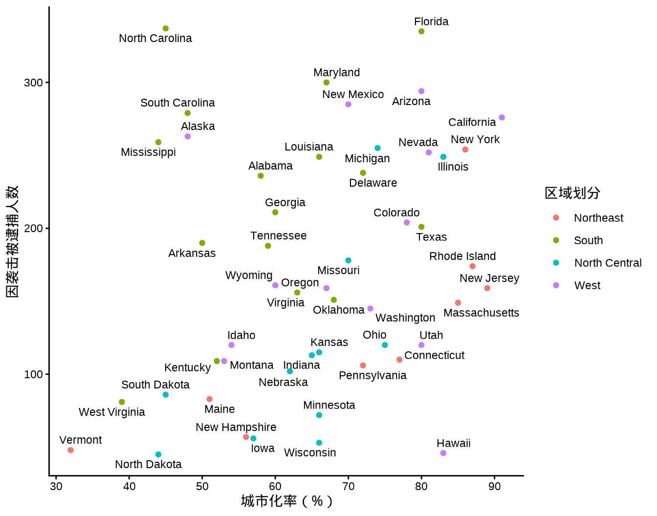 library(spData)library(spdep)# KNN K-近邻方法获取邻接矩阵k4.48<-knn2nb(knearneigh(as.matrix(centers48), k =4))# Moran I testmoran.test(x = arrests48$Assault, listw =nb2listw(k4.48))