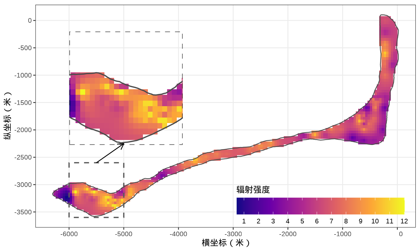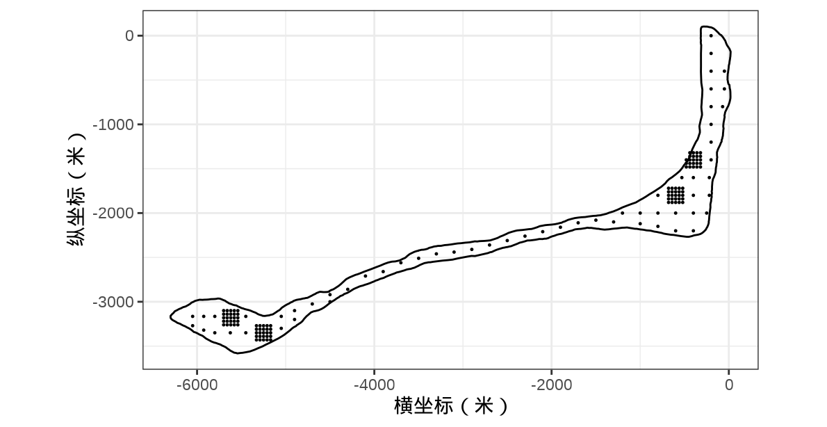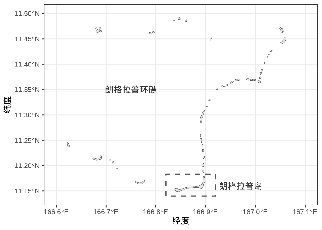 # 将 sfc 类型转化为 sf 类型rongelap_coastline_grid <-st_as_sf(rongelap_coastline_grid)rongelap_coastline_buffer <-st_as_sf(rongelap_coastline_buffer)rongelap_grid <- rongelap_coastline_grid[rongelap_coastline_buffer, op = st_intersects]# 计算网格中心点坐标rongelap_grid_centroid <-st_centroid(rongelap_grid)