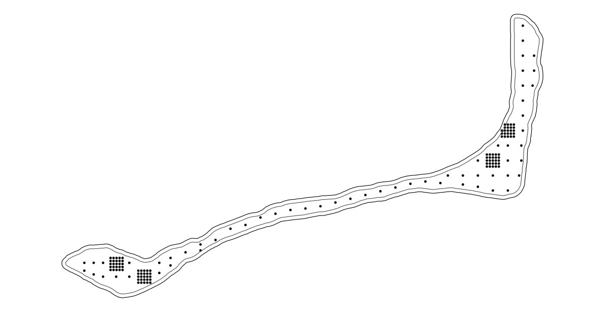 ggplot() +geom_sf(data = rongelap_coastline_grid, fill =NA, color ="gray") +geom_sf(data = rongelap_coastline_sfp, fill =NA, color ="gray30") +geom_sf(data = rongelap_coastline_buffer, fill =NA, color ="black") +theme_void()
