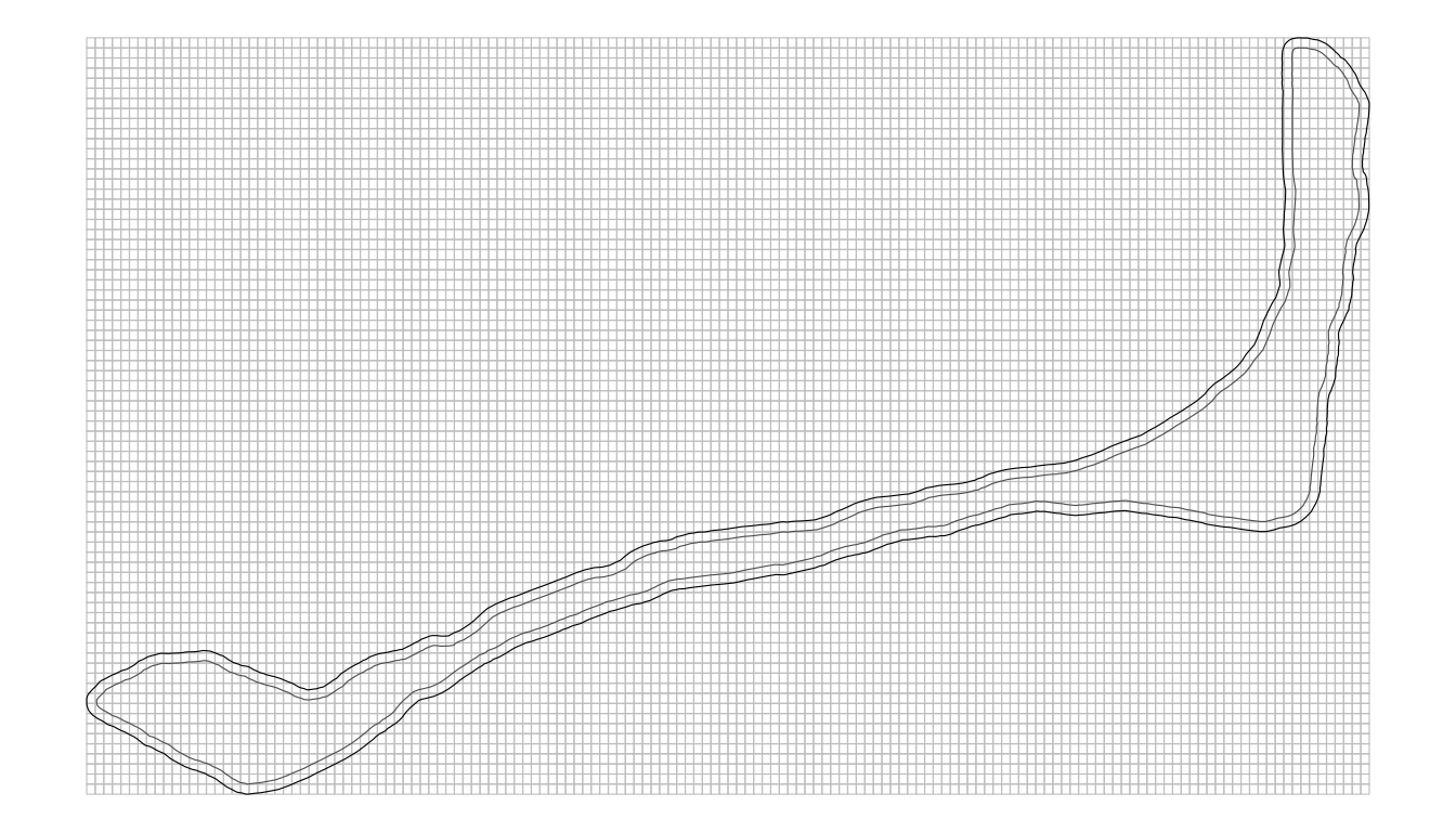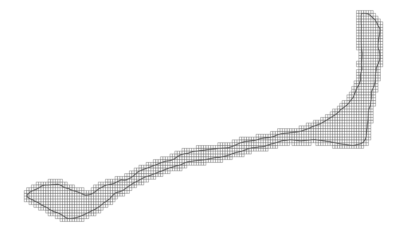 ggplot() +geom_sf(data = rongelap_coastline_sfp, fill =NA, color ="gray30", linewidth =0.5) +geom_sf(data = rongelap_grid, fill =NA, color ="gray30") +theme_void()