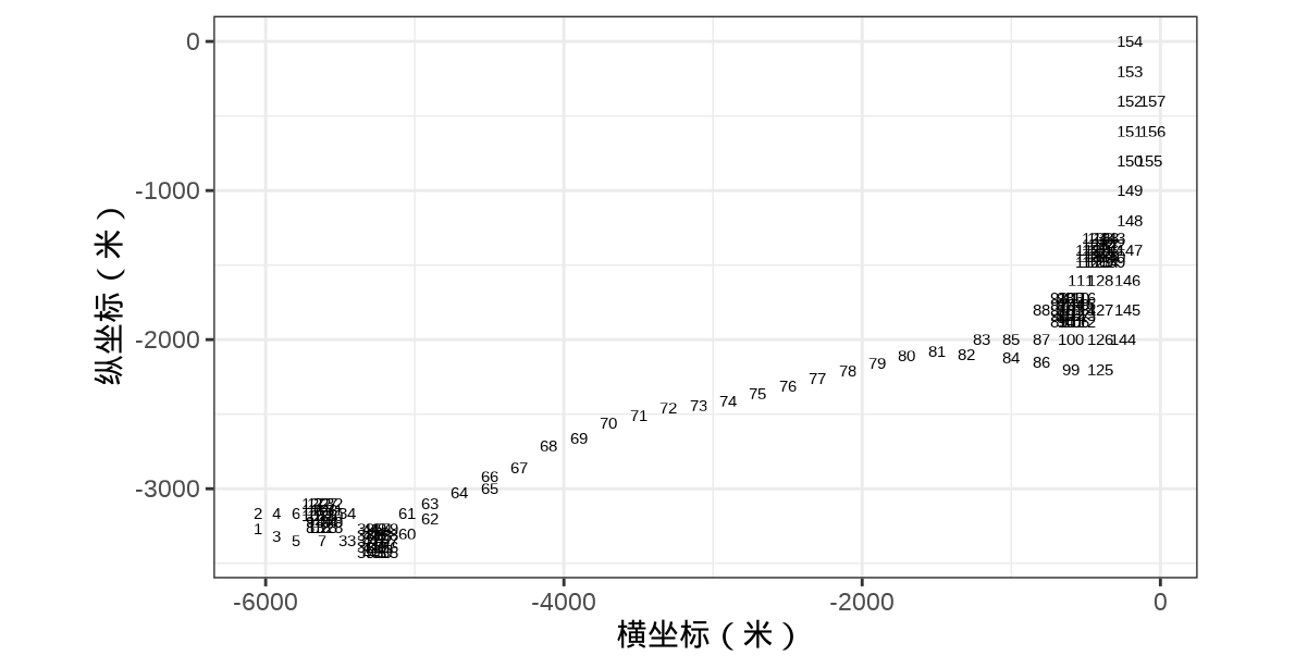 Ole F. Christensen 和 Paulo J. Ribeiro Jr 将 rongelap 数据集存放在 geoRglm(Christensen 和 Ribeiro Jr. 2002) 包内,后来,geoRglm 不维护,已从 CRAN 移除了,笔者从他们主页下载了数据。数据集 rongelap 记录了 157 个测量点的伽马射线强度,即在时间间隔 time (秒)内放射的粒子数目 counts(个),测量点的横纵坐标分别为 cX (米)和 cY(米),下 表 13.1 展示部分朗格拉普岛核辐射检测数据及海岸线坐标数据。