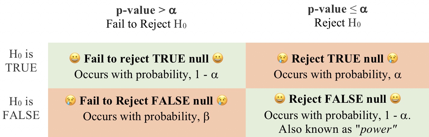 By custom, if our p-value is smaller than \(\alpha\) (a number which is by convention set, somewhat arbitrarily to 0.05) we reject the null hypothesis, and say the result is ✌️ statistically significant ✌️. What does this mean? It means that if we set \(\alpha\) at its customary cut value of \(0.05\), we will get a false positive – that is we will reject a true null hypothesis, in 5% of studies where the null is actually true.