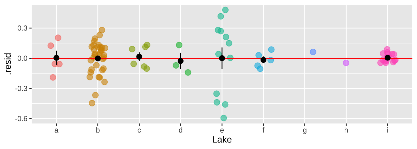 That would be a big mistake – as each fish is not independent. There could be something else about the lake associated with levels of Selenium in fish that is not in our model. This seems likely, as we see below, that residuals differ substantially by lake.