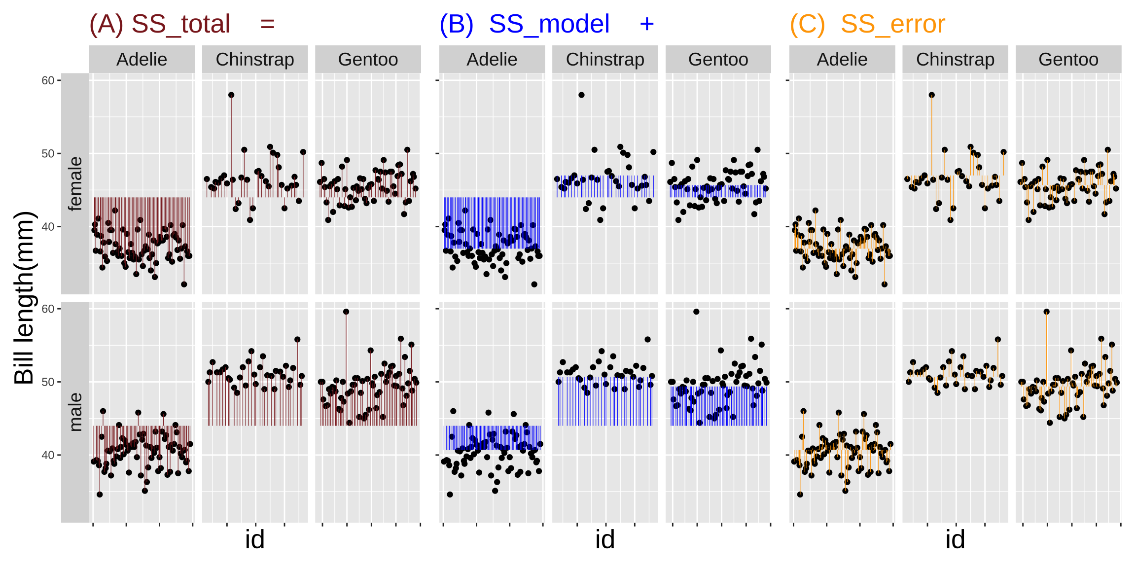 Figure 4: Partitioning the sums of squares for a model of penguin bill length as a function of sex (code here).