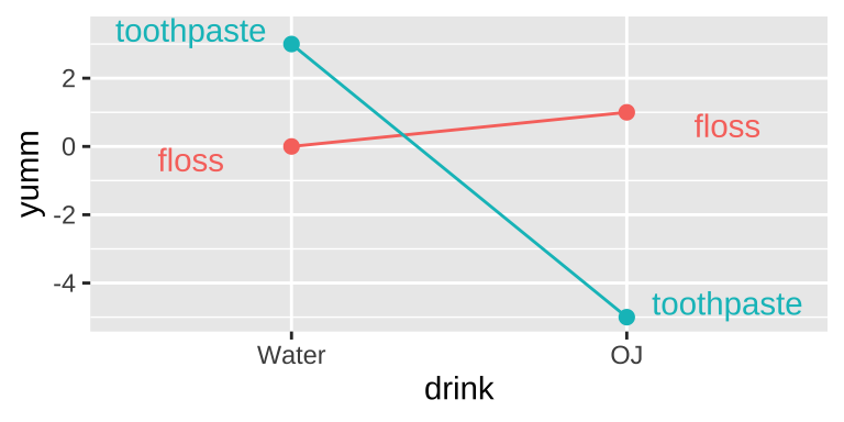 This is an extreme case. More broadly, an interaction is any case in which the slope of two lines differ – that is to say when the effect of one variable on an outcome depends on the value of another variable.