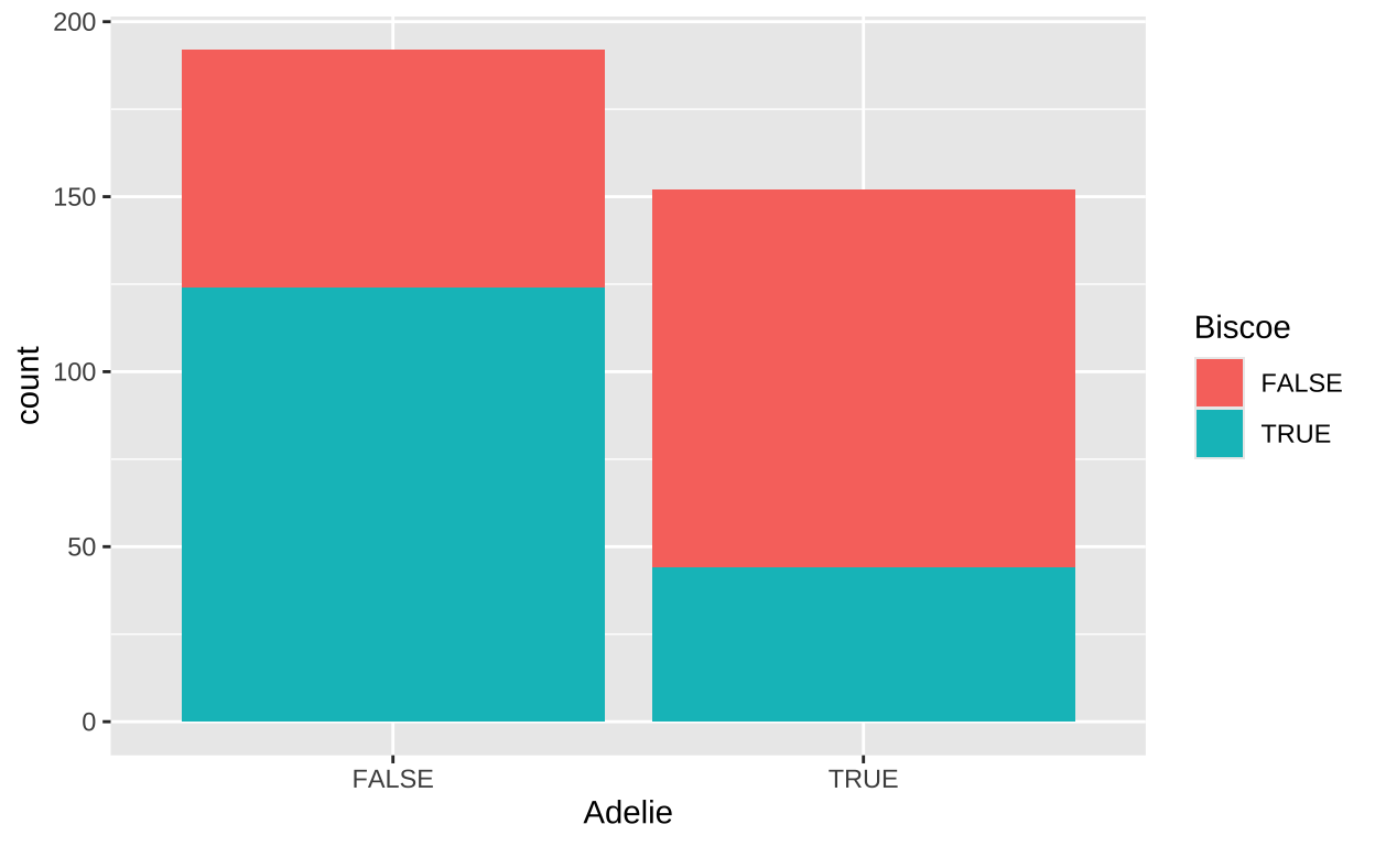 We have previously discussed that associations aren’t limited to continuous variables; we can also describe associations between categorical variables, often in the form of covariance or correlation. Let’s explore the covariance between a penguin being an “Adelie” species and its origin from “Biscoe” island.
