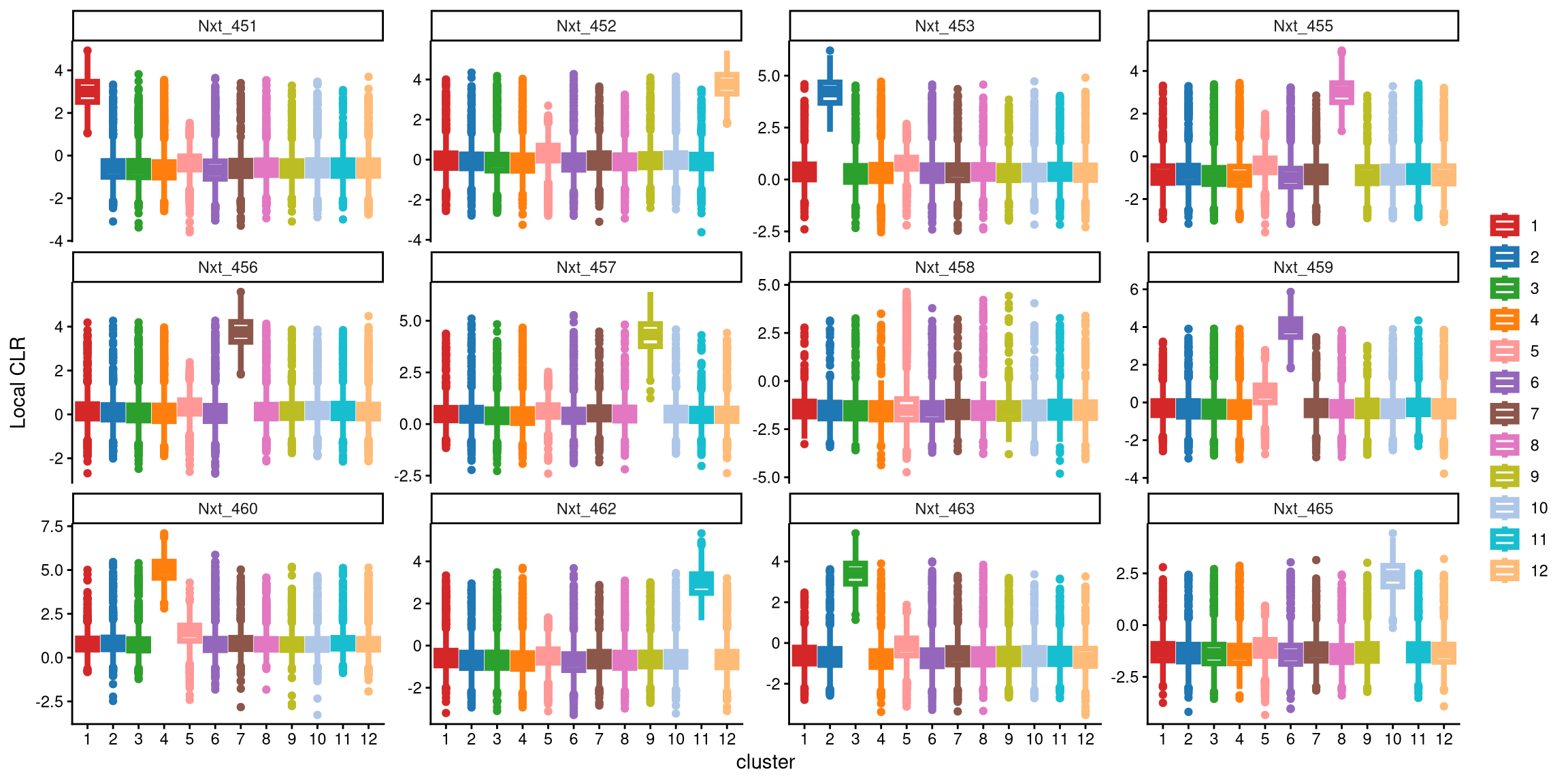 The local CLR-normalized values are used here for K-medoids clustering. Since this dataset has twelve samples, the default parameters are initially applied, which divide the cells into twelve clusters.