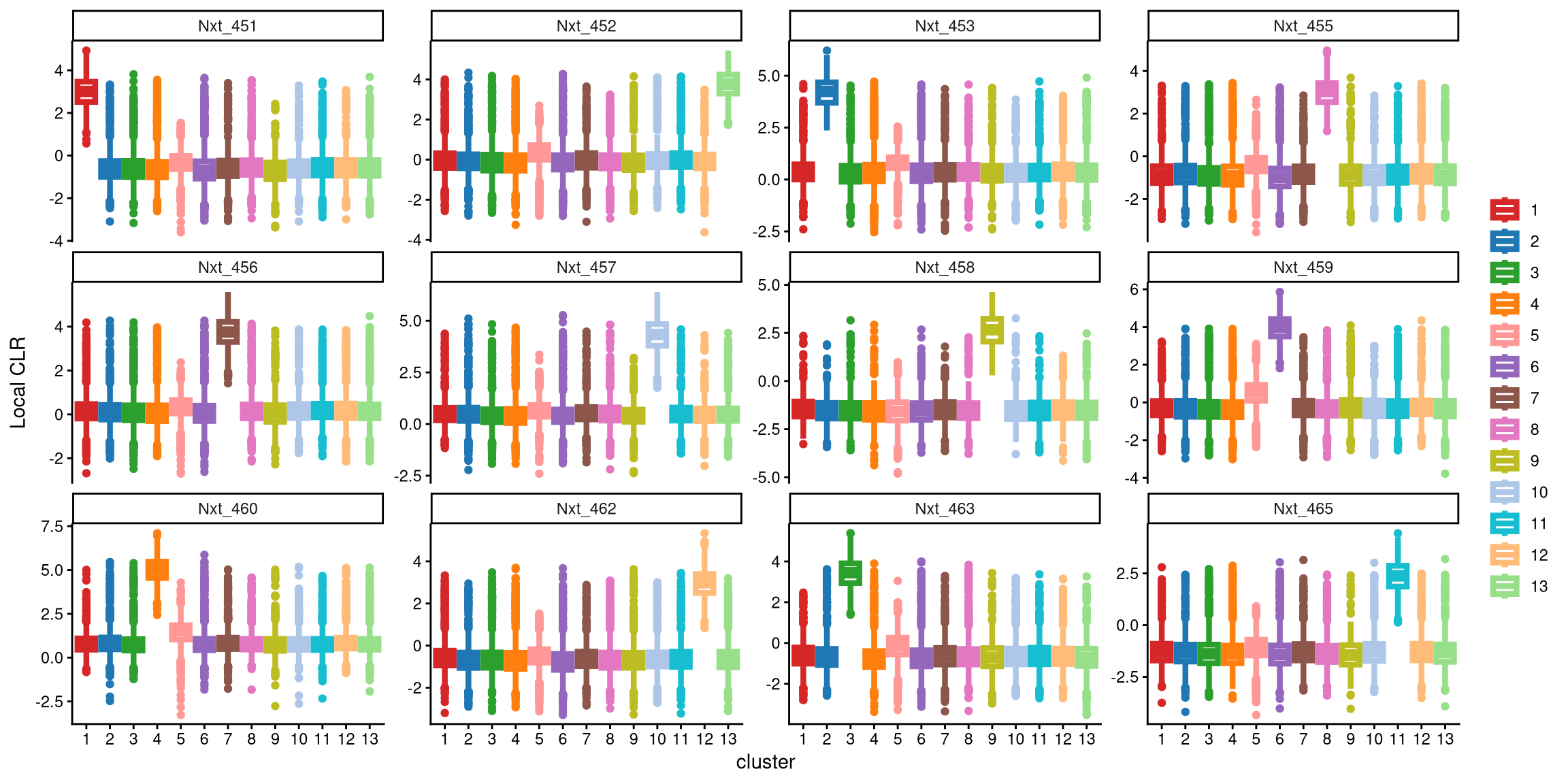 Each cluster will be labelled with its original sample, and here we use the alternative labelling method, “expression”. The expression-based labelling method can be explained using the plot from CheckCLRBoxPlot. Each hashtag sample is assigned to the cluster whose box has the maximum median local CLR value. For example, Nxt_451 is highly expressed in cluster 1 compared with the other clusters; therefore, cluster 1 corresponds to the Nxt_451 sample.