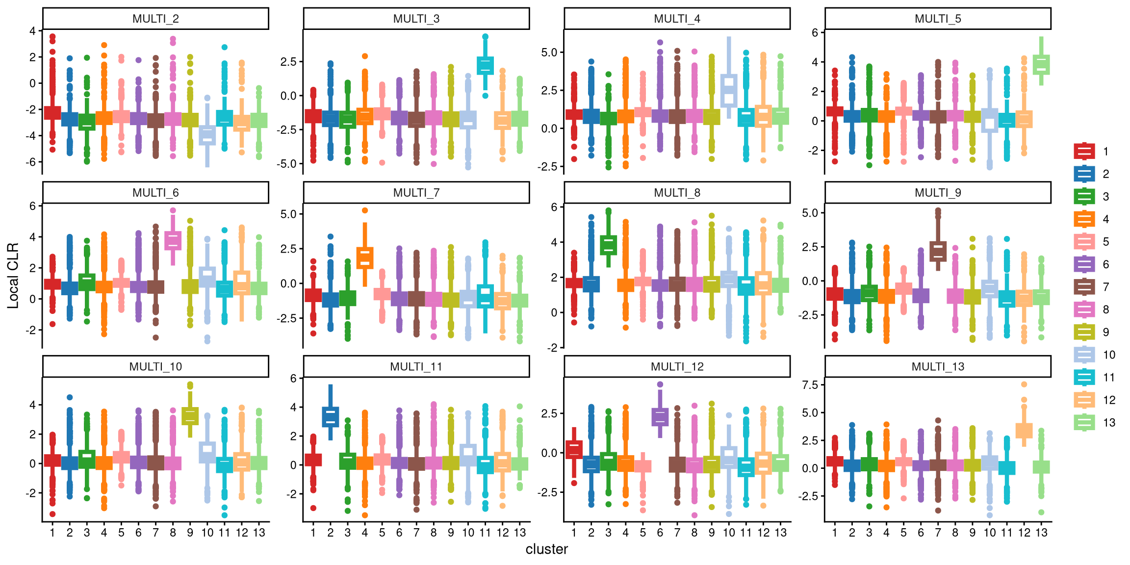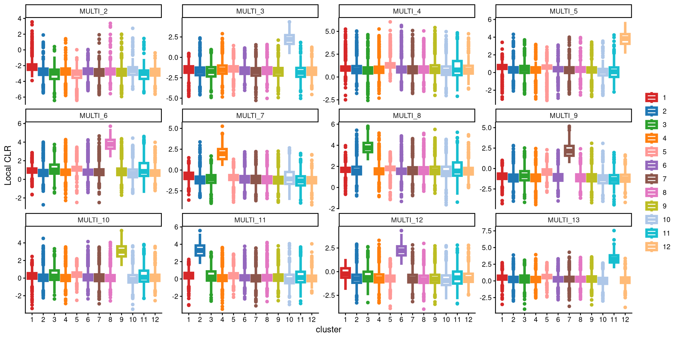 For example, in MULTI_3, the largest box with 12 clusters corresponds to cluster 10, while with 13 clusters, it corresponds to cluster 11. The CLR difference between these two boxes is quite small, less than 1. In contrast, for MULTI_4, the largest box with 12 clusters is cluster 11, while with 13 clusters, it is cluster 10. The median CLR difference between these two boxes is significantly larger, exceeding 1.