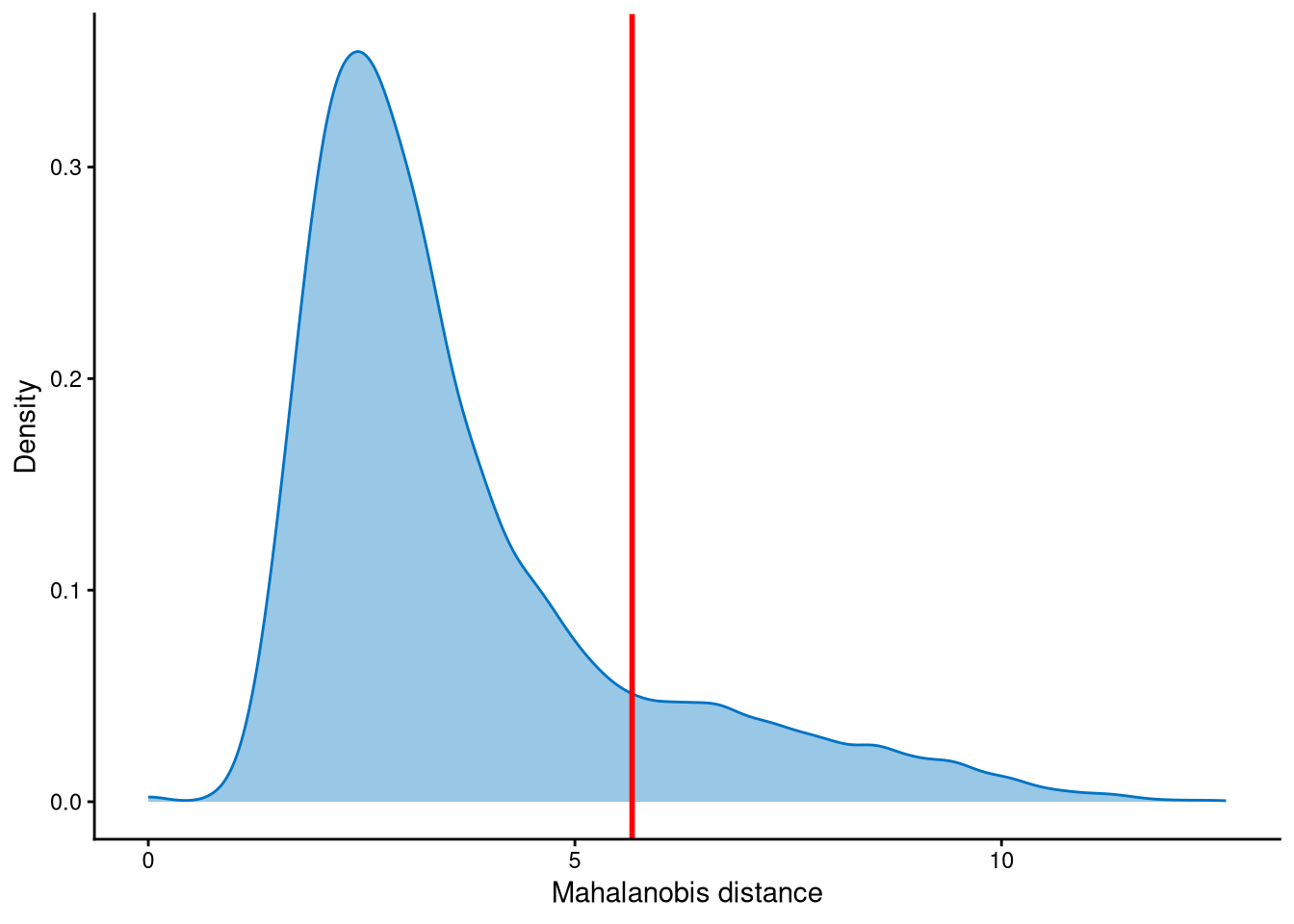 Outlier cells, including negatives and doublets, are defined based on the distribution of the minimum Mahalanobis distance across all cells, which can be visualized using MDDensPlot. The cut-off in the plot is determined by the md_cut_q parameter, which specifies the quantile of the distribution and is shown as the red line. Users are encouraged to adjust the cut-off through the md_cut_q parameter.