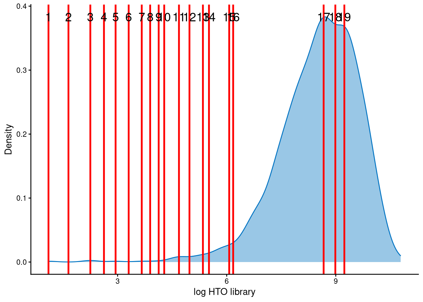 The distribution of HTO library sizes for these outlier cells is not typically multimodal; instead, it is left-skewed. The 19 lines represent possible cut-offs used to distinguish negatives from doublets. These lines indicate all modes and anti-modes. Line 12 is an appropriate cut-off for separating negatives from doublets, and the corresponding HTO library size (total hashtag counts per cell) is approximately \(e^5\approx148\), which is a reasonable threshold.