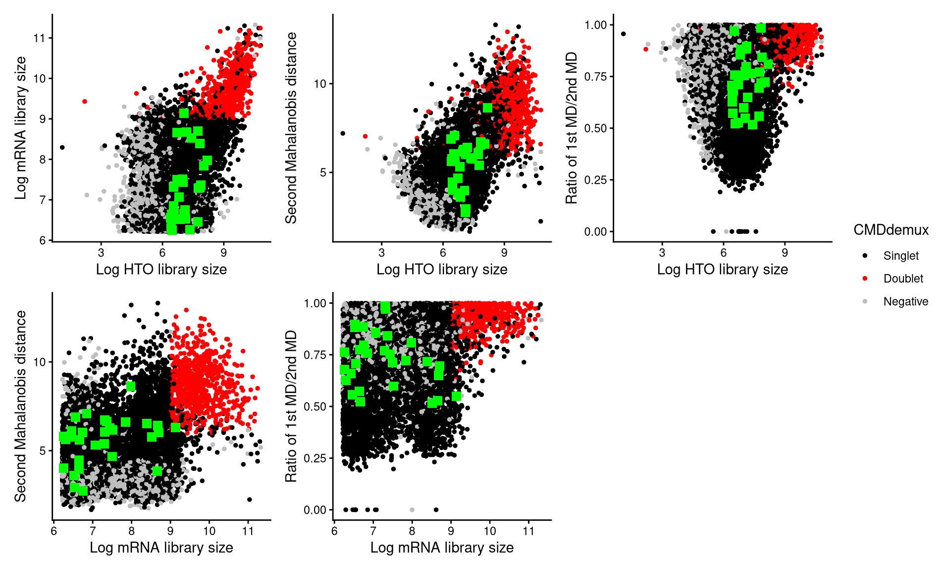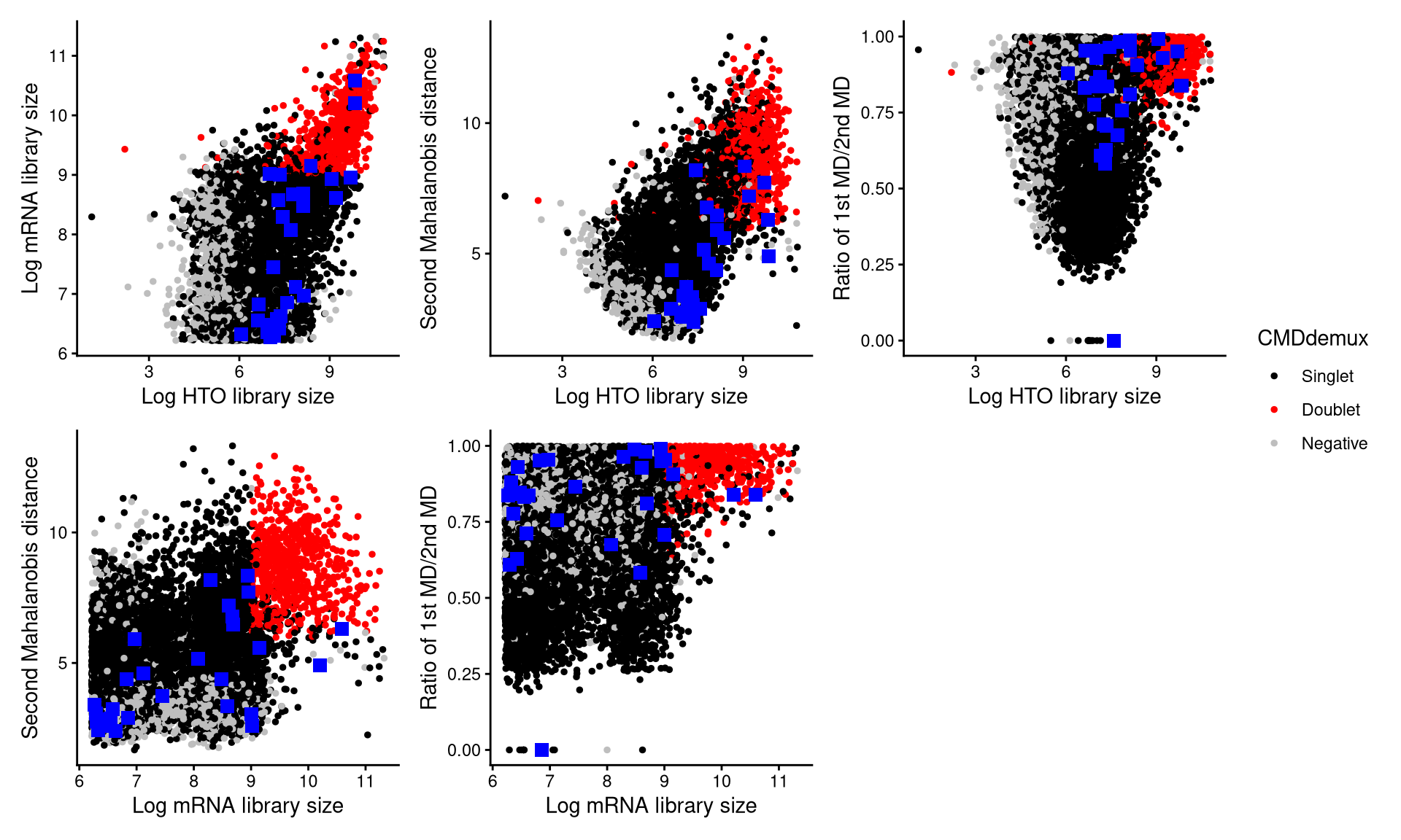 CheckAssign2DPlot consists of pairwise 2D plots of HTO library sizes, mRNA library sizes, the second Mahalanobis distance, and the ratio of the first to the second Mahalanobis distance. Negatives, singlets, and doublets are separated into different regions in these 2D plots.