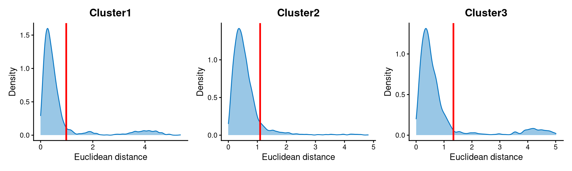 Cells with Euclidean distances larger than the cut-off in the above plot are defined as non-core cells; otherwise, they are core cells. For this dataset, the cut-offs are set at the tails of each distribution.