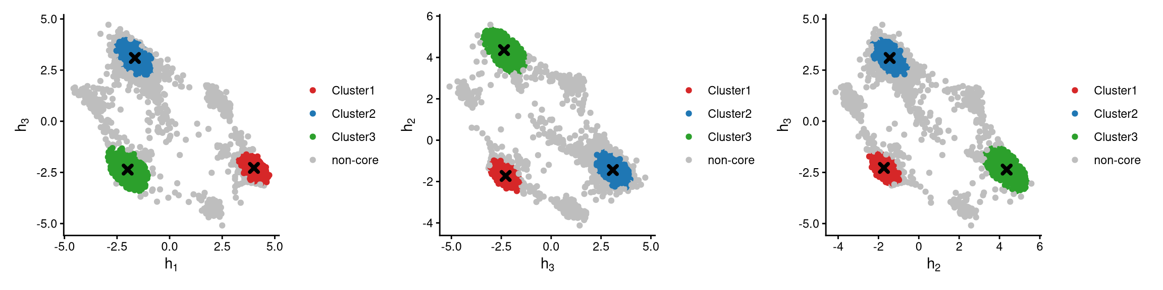 In the plots above, cluster centroids are shown as cross symbols. Core cells cluster around their centroid, while non-core cells lie at the edges of each cluster.
