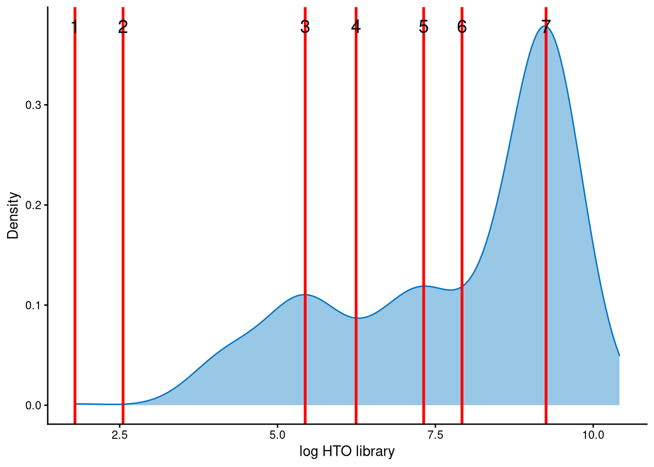 The possible cut-offs for distinguishing negatives and doublets are shown as red vertical lines, representing the modes and anti-modes of the distribution. The distribution is tri-modal, and the default value of the parameter num_modes (the number of modes to detect) is insufficient to capture all modes and anti-modes. Therefore, we set num_modes to 4 for this dataset. Users can then select an appropriate cut-off based on the line index. The assumption is that negative cells have smaller HTO library sizes, whereas doublets have larger HTO library sizes. In this dataset, line index 4 is considered an appropriate cut-off, as it corresponds to an HTO library size of approximately \(e^6=403\). The HTO library size is the total number of hashtag UMIs per cell, and \(e^6\) provides a reasonable threshold for distinguishing negatives from doublets. In contrast, line index 3 corresponds to \(e^{5.2}\approx181\), which is too small, while line index 5 corresponds to \(e^{7.5}\approx1636\), which is too large.