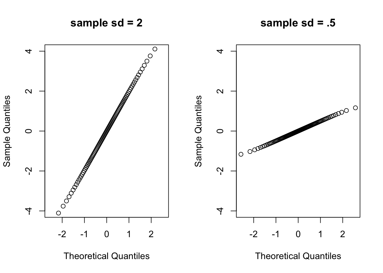 qqnorm(qnorm(seq(0.01,0.99,0.01), mean= 0, sd = 0.5), ylim = c(-4,4),