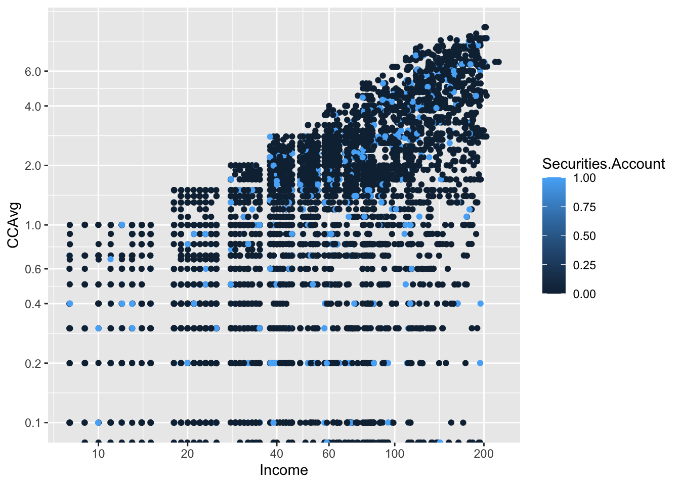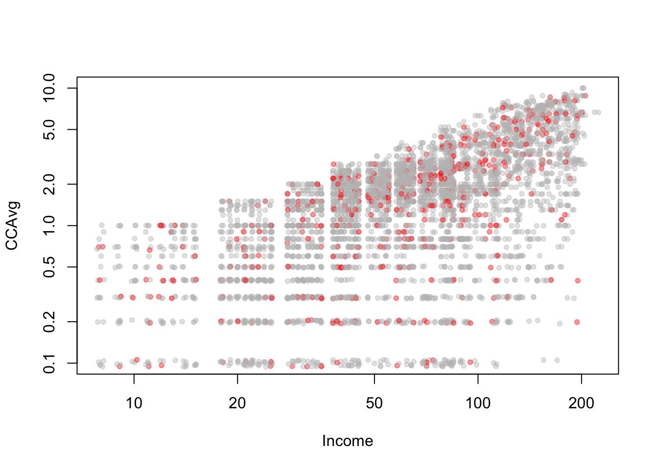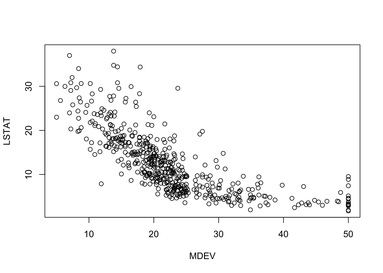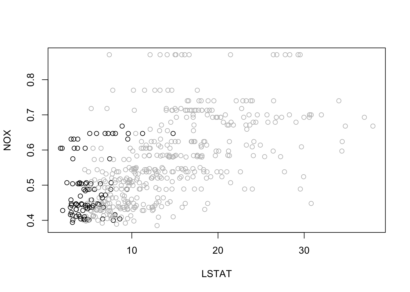 plot(y=BostonHousing$nox, x=BostonHousing$lstat, ylab ="NOX", xlab ="LSTAT",col =ifelse(BostonHousing$medv >30, "black", "gray"))# add legend outside of plotting area# In legend() use argument inset = to control the location of the legend relative# to the plot.legend("topleft", inset=c(0, -0.2),legend =c("MEDV > 30", "MEDV <= 30"), col =c("black", "gray"),pch =1, cex =0.5)# alternative plot with ggplotlibrary(ggplot2)