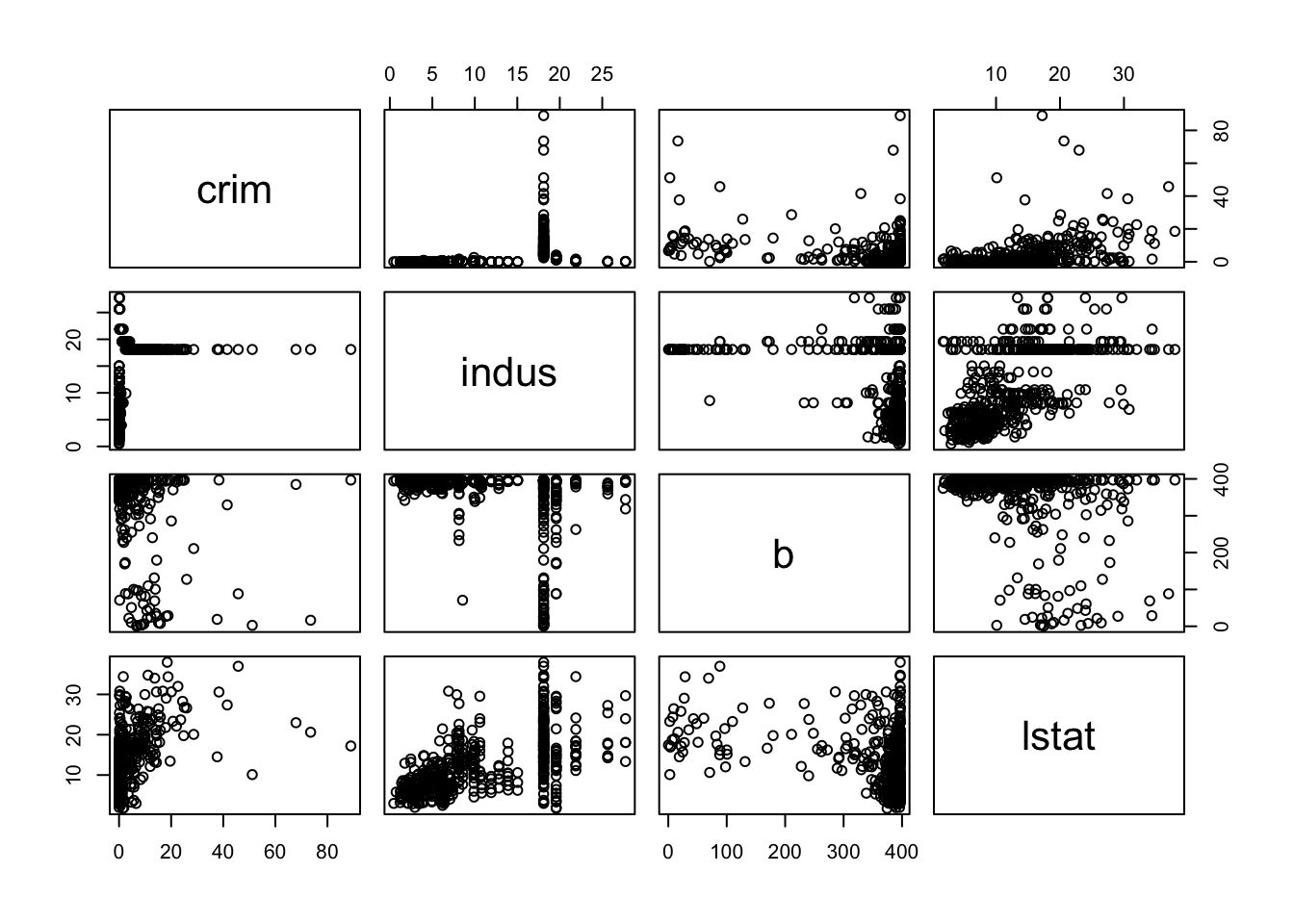 ## simple plot# use plot() to generate a matrix of 4X4 panels with variable name on the diagonal,# and scatter plots in the remaining panels.plot(BostonHousing[, c(1, 3, 12, 13)])