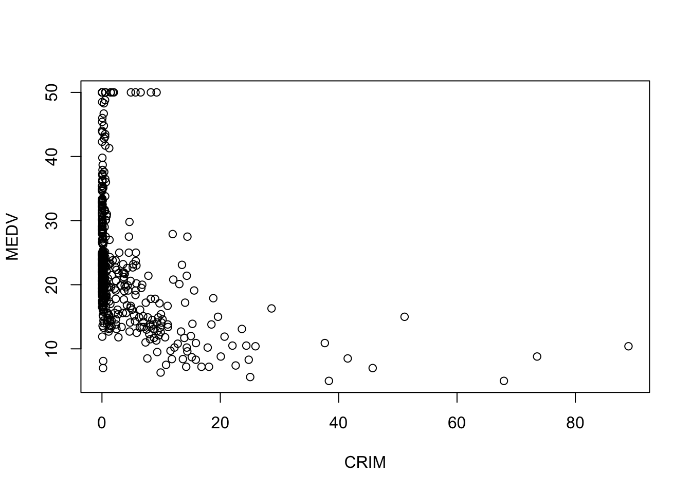 # to use logarithmic scale set argument log = to either 'x', 'y', or 'xy'.plot(BostonHousing$medv ~ BostonHousing$crim,xlab ="log(CRIM)", ylab ="log(MEDV)", log ='xy')