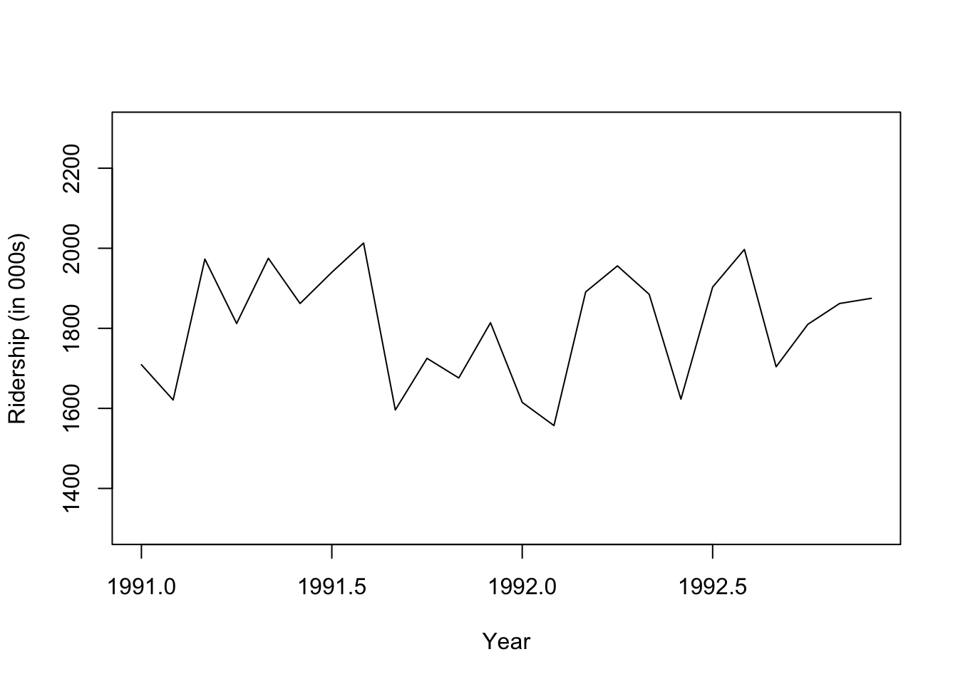 ## zoom in, monthly, and annual plotsridership.2yrs <-window(ridership.ts, start =c(1991,1), end =c(1992,12))plot(ridership.2yrs, xlab ="Year", ylab ="Ridership (in 000s)", ylim =c(1300, 2300))