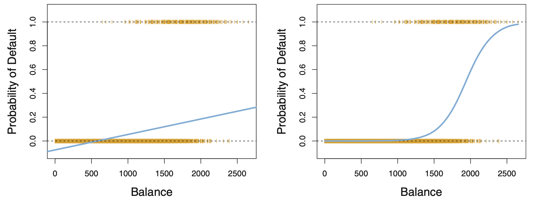 FIGURE 4.2 in [ISLR]. Left: 파란색 선은 선형회귀분석(즉 최소제곱법)으로 추정한 확률값이다. 추정된 확률값이 음수도 된다! 오렌지색 점들은 자료에서의 \(y\)값 (\(0 / 1\)) 들이다. Right: 로지스틱 회귀분석으로 추정한 확률값이다. 모든 확률값들이 0과 1사이에 있다.