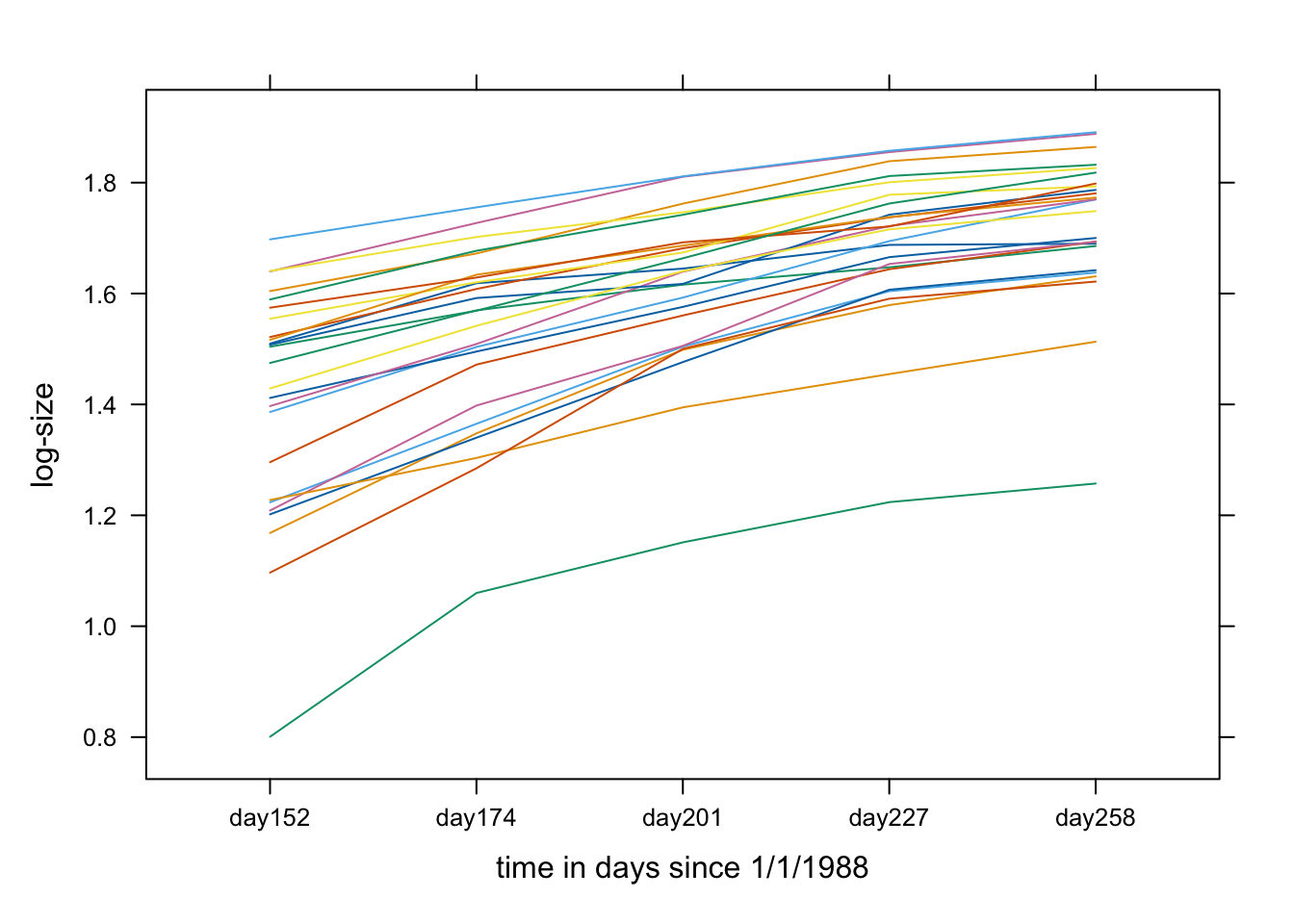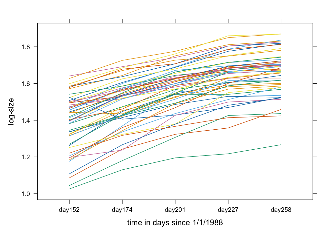 xyplot(log(spruce3[id >= 55, 3]) ~ spruce3[id >= 55, 2], groups=spruce3[id >= 55, 1], type="l", xlab="time in days since 1/1/1988", ylab="log-size")