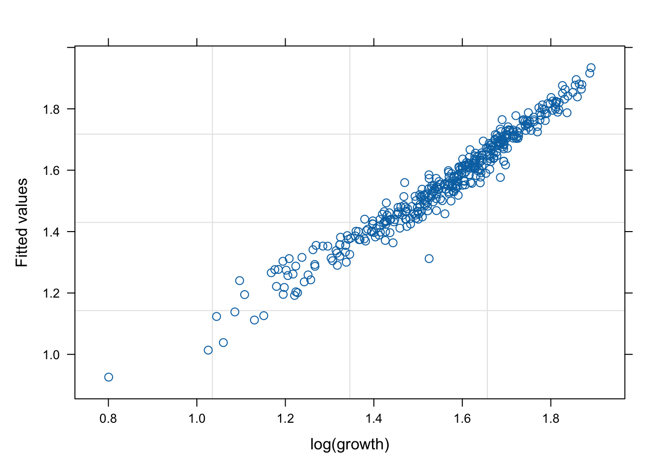 plot (mod1, fitted (.) ~ log (growth))