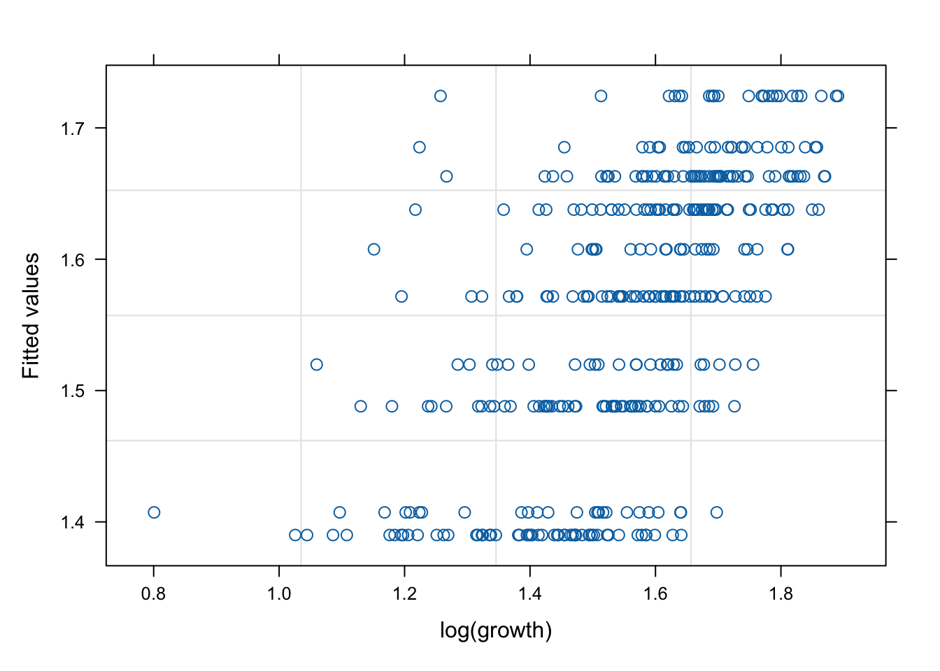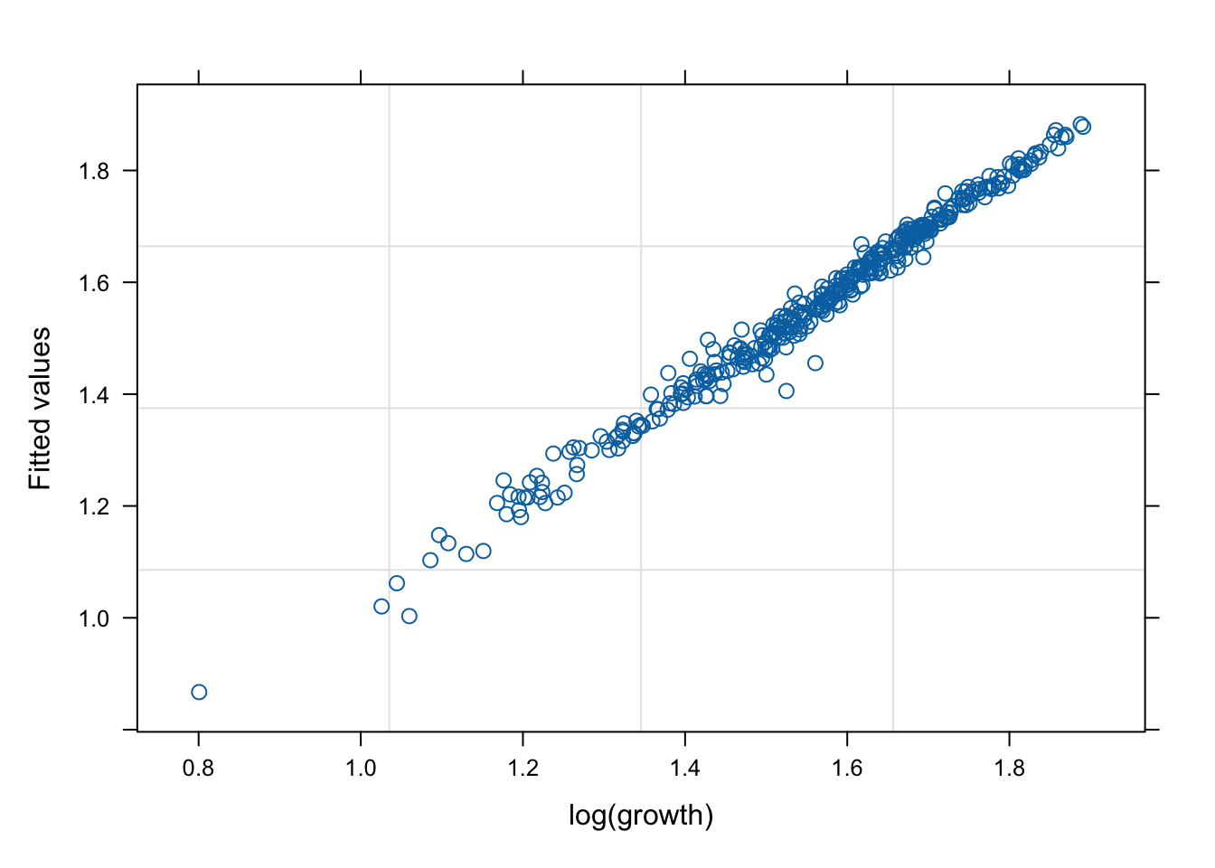 plot (mod1s, fitted (.) ~ log (growth))