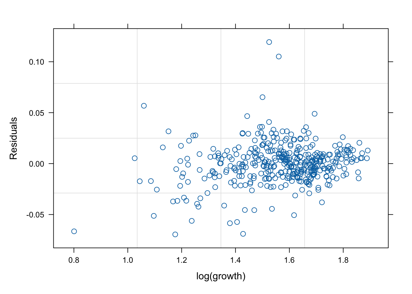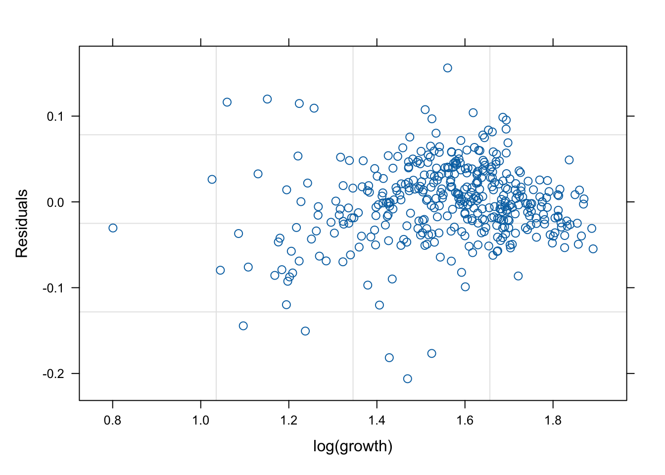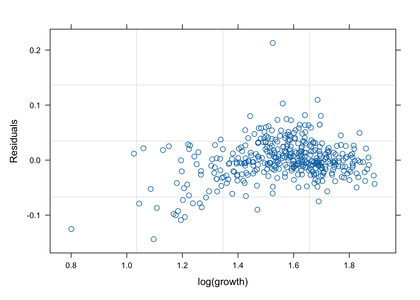 plot (mod1s, resid (.) ~ log (growth))