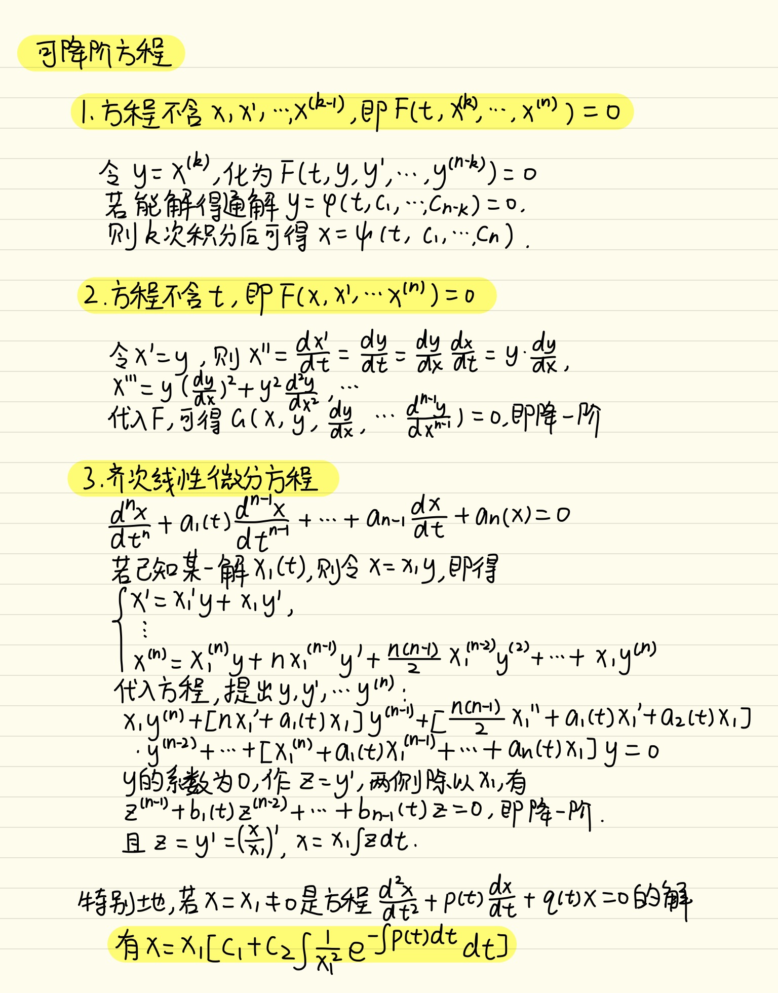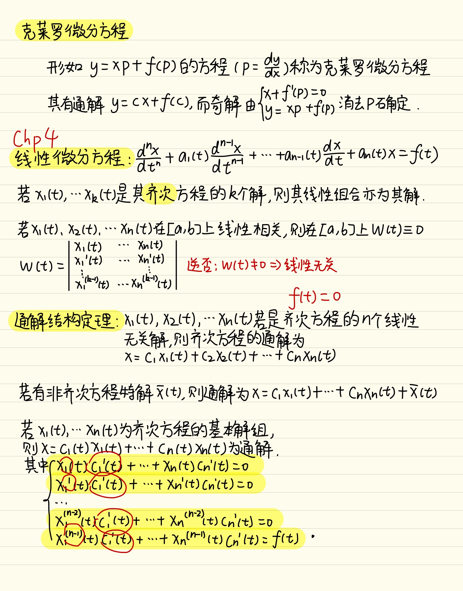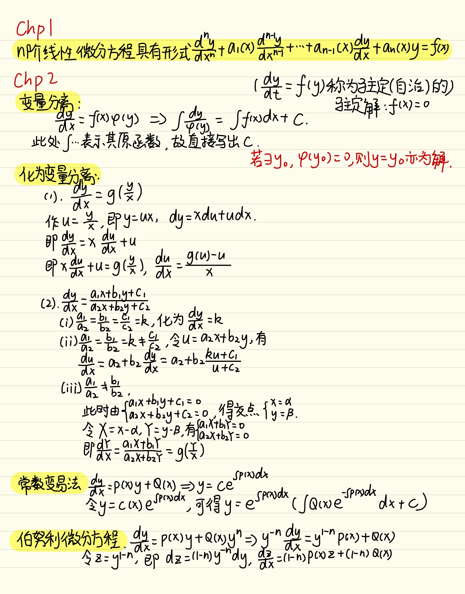 常微分方程笔记主要内容为一阶微分方程解的存在性与解法、高阶微分方程与线性微分方程组等内容。