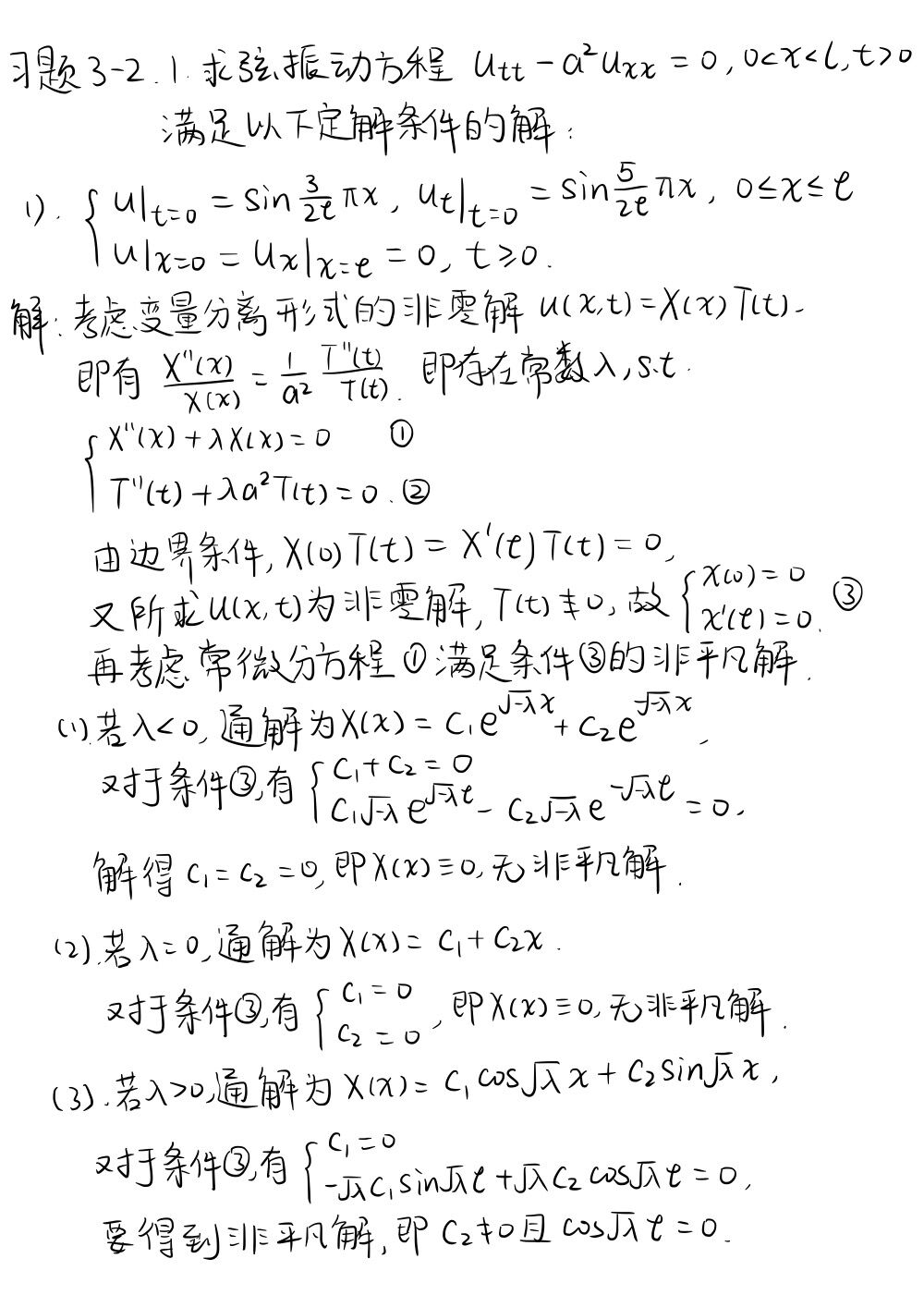 此处我们直接阐述变量分离法的基本思想与求解方法, 以波动方程为例. 考虑方程 \[\left\{\begin{array}{ll} u_{tt}-a^{2} u_{x x}=0, & 0<x<l, t>0 \\ \left.u\right|_{t=0}=\varphi(x),\left.u_t\right|_{t=0}=\psi(x), & 0 \le x \le l \\ \left.u_{x}\right|_{x=0}=0,\left.\quad u_{x}\right|_{x=l}=0, & t\ge0 \end{array}\right.\tag{3.1}\] 若假设方程具有变量分离形式\(u(x,t)=X(x)T(t)\)形式的特解, 则应当满足 \[\frac{X^{\prime \prime}(x)}{X(x)}=\frac{1}{a^{2}} \frac{T^{\prime \prime}(t)}{T(t)}=-\lambda\tag{3.2}\] 其中\(\lambda\)为常数. 对于非零解有\(T(t)\neq0\), 则得到子问题 \[\left\{\begin{array}{l} X^{\prime \prime}(x)+\lambda X(x)=0 \\ X(0)=X(l)=0 \end{array}\right.\tag{3.3}\] 进一步分析可得到, 若要得到非平凡解, 则仅当\(\lambda>0\)时才可取得. 此时我们将问题\((3.3)\)解得的特征根\(\{\lambda_k\}\)构造满足\(\lambda=\lambda_k\)时式子\((3.2)\)确定的函数\(X\)和\(T\), 进而解出一个解\(u_k(x,t)=X_k(x)T_k(t)\). 再考虑当解取 \[u(x,t)=\sum_{k=1}^\infty u_k(x,t)\]时确定各\(u_k(x,t)\)中的待定参数, 便可以得到形式上的解, 再通过验证一致收敛性表明此时得到的解即为原问题的解, 因而成功进行求解.