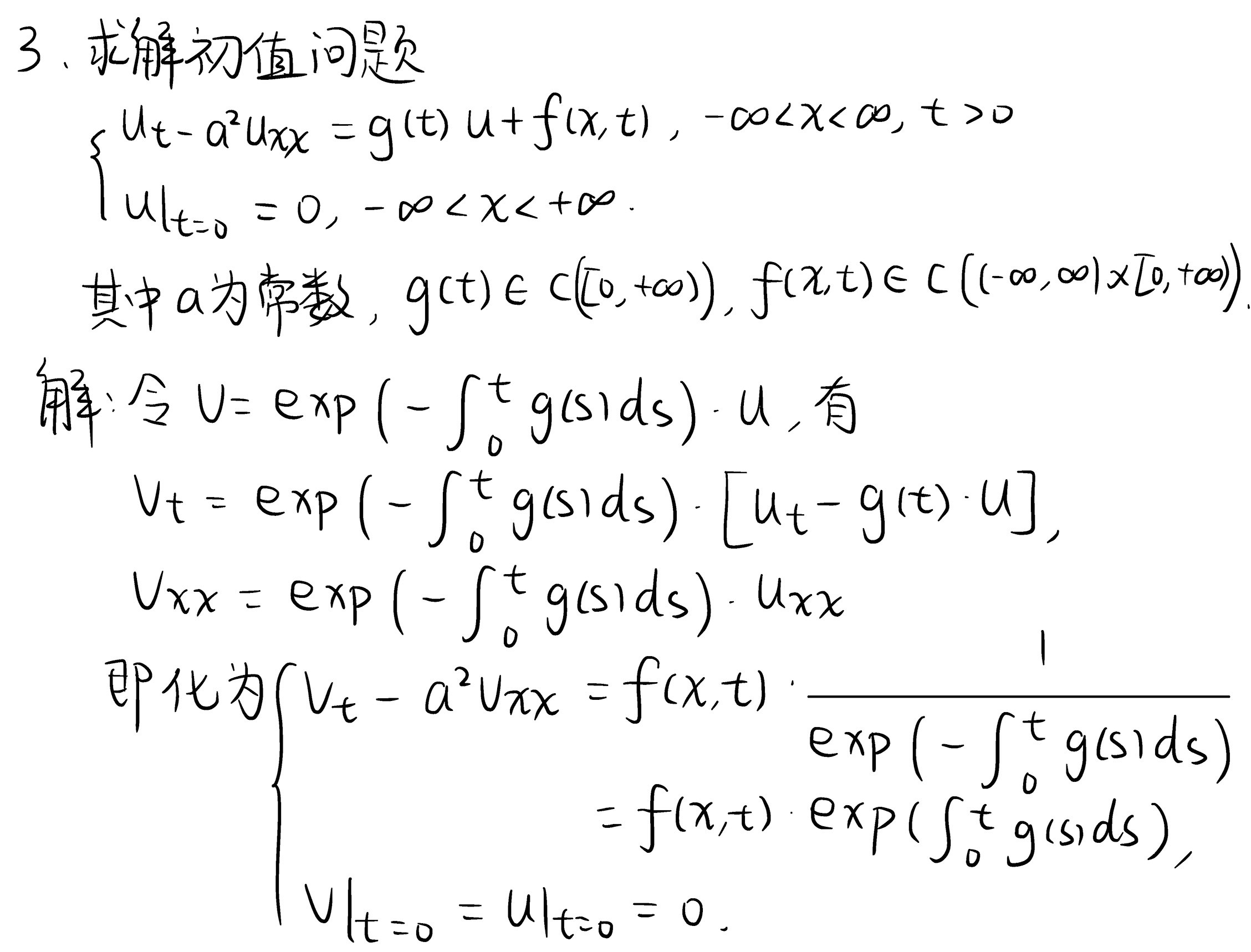 该公式称为Poisson公式, 其中函数\(G(x,t)\)称为热核函数. 对于非齐次的情形, 我们可以通过Duhamel原理进行求解. 下面我们给出一道习题加深理解. 在这一题中, 巧妙地使用了一个变换, 消去了原始方程中等式右侧的变量\(g(t)u\), 转化为可以使用Duhamel原理进行求解的形式, 虽然方法不唯一, 但是在这一方法中, 该变换是十分重要的.