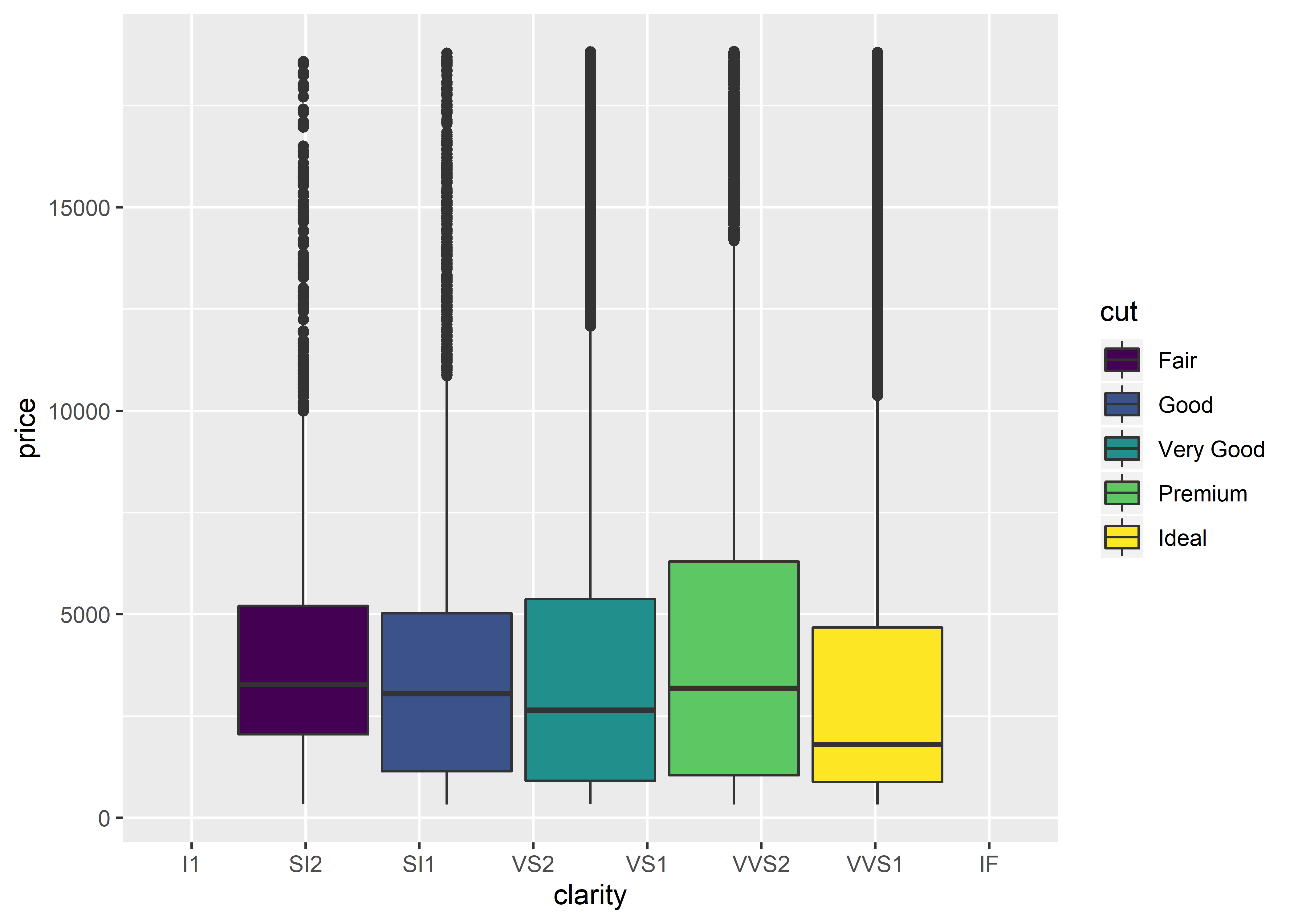 diamonds %>% group_by(clarity, cut) %>% ggplot(aes(x = clarity, y = price, group = cut, fill = cut)) + geom_boxplot()