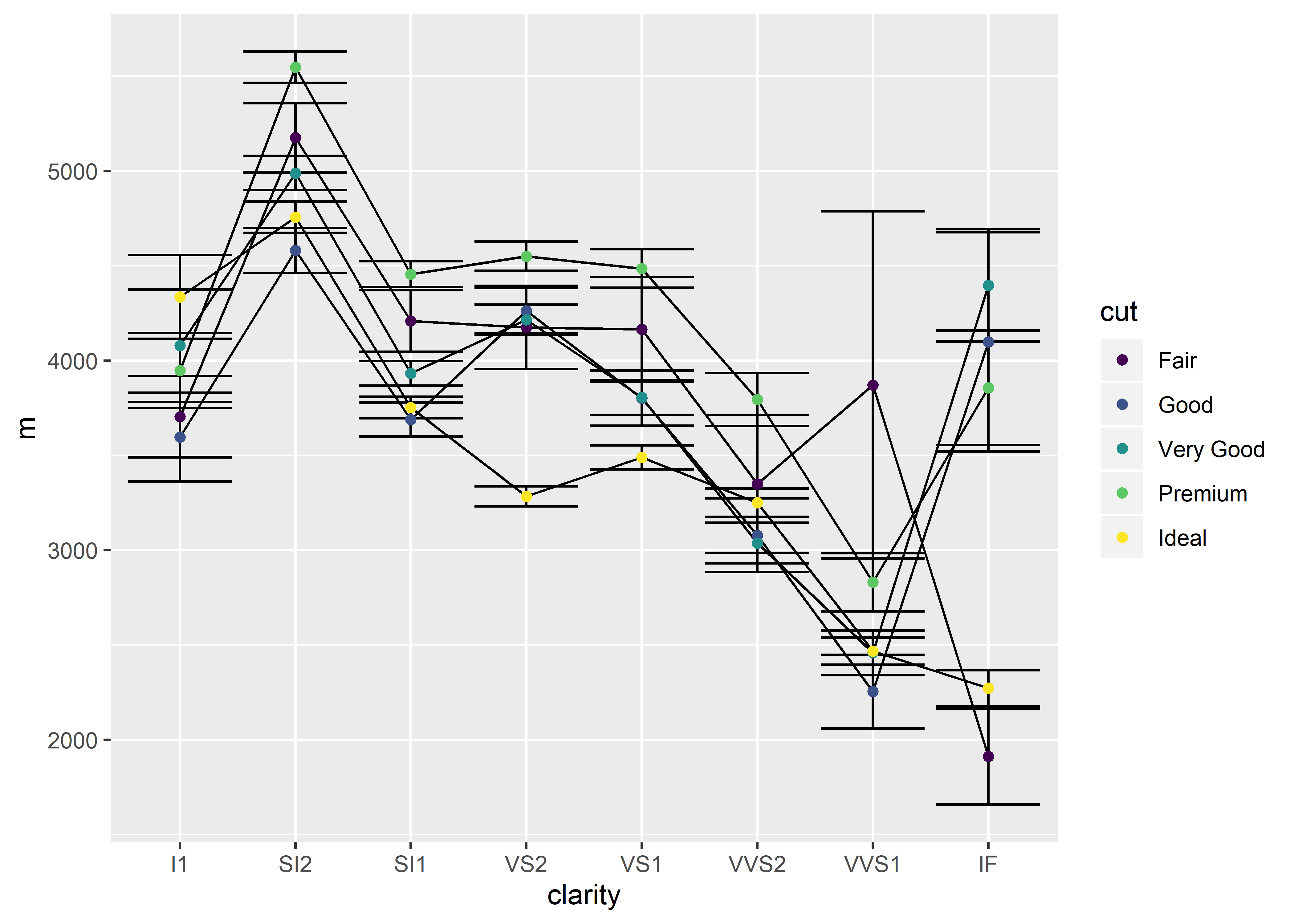 Moving the geom_point() element below geom_line() will result in the points laying over the error bars and connecting lines: