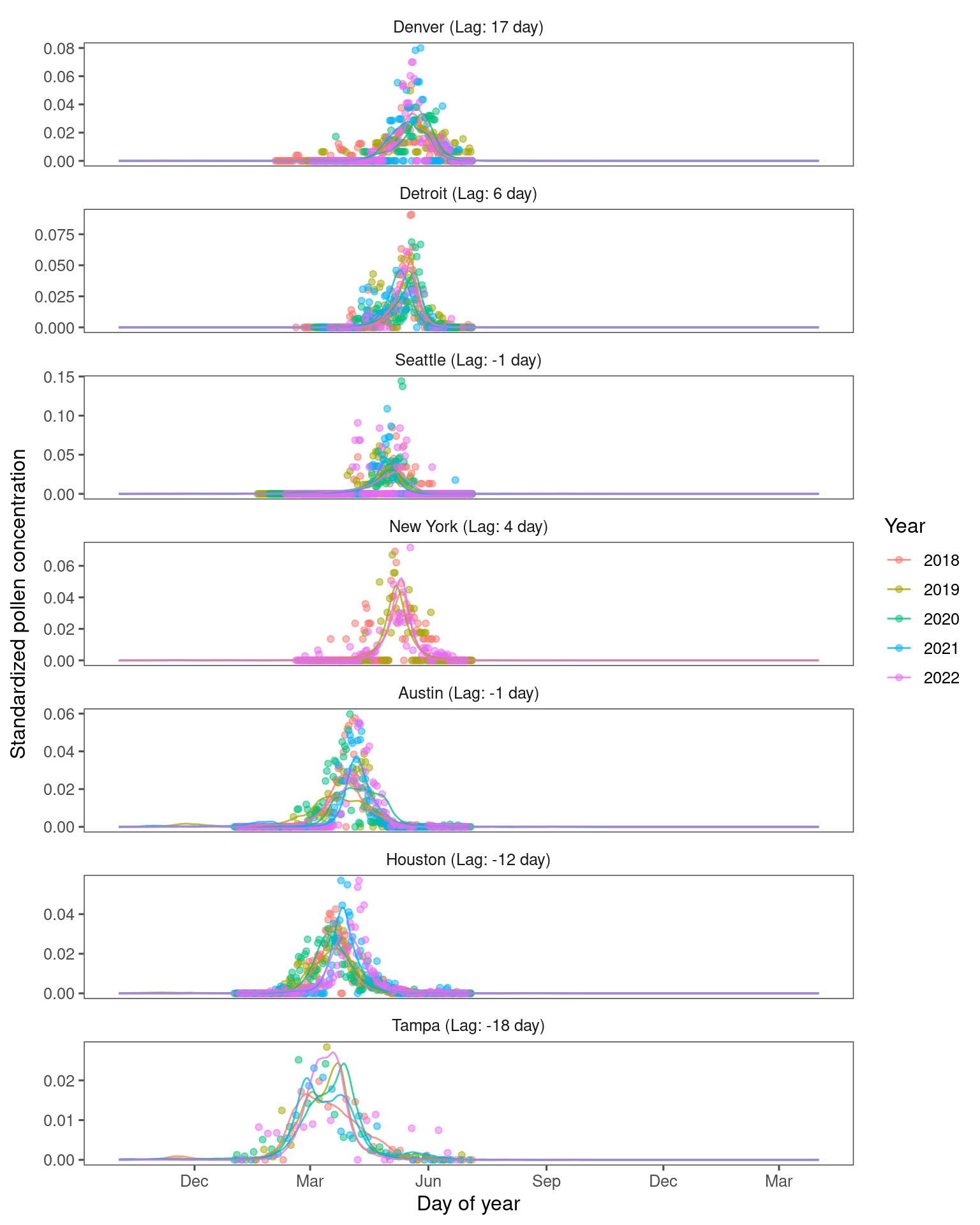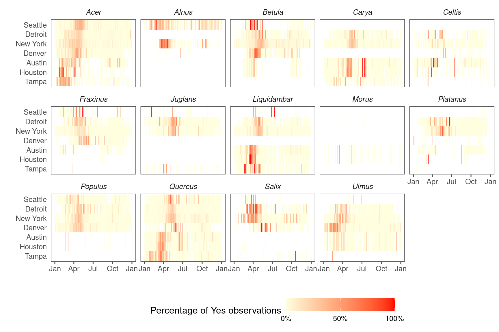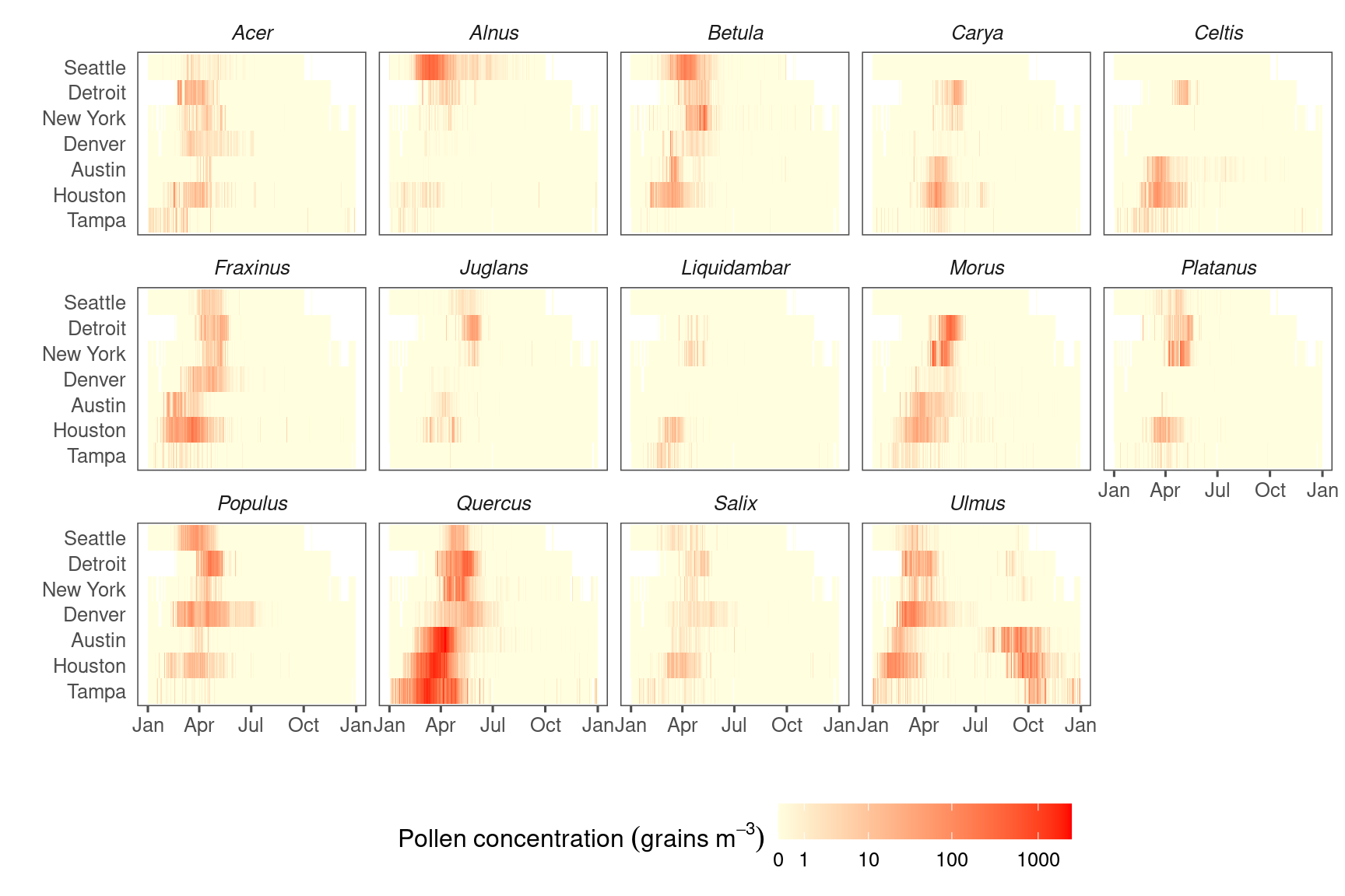 Exceptions: Denver pollen data are from Colorado Springs; Austin pollen data are from Georgetown; Detroit pollen data are from Sylvania.