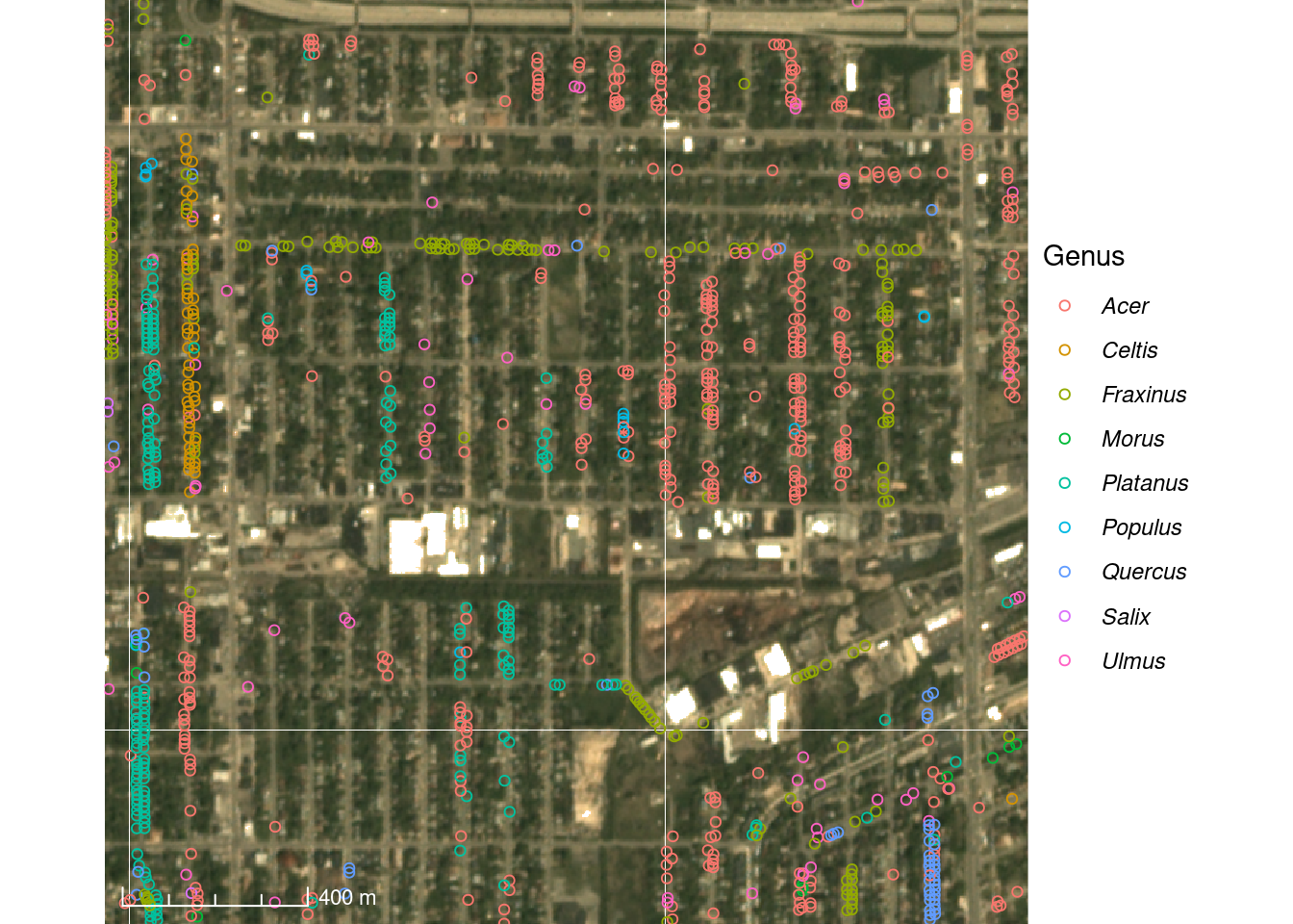 Here we visualize a subset of street trees in Detroit overlayed on a true-color PlanetScope image on May 8, 2017.