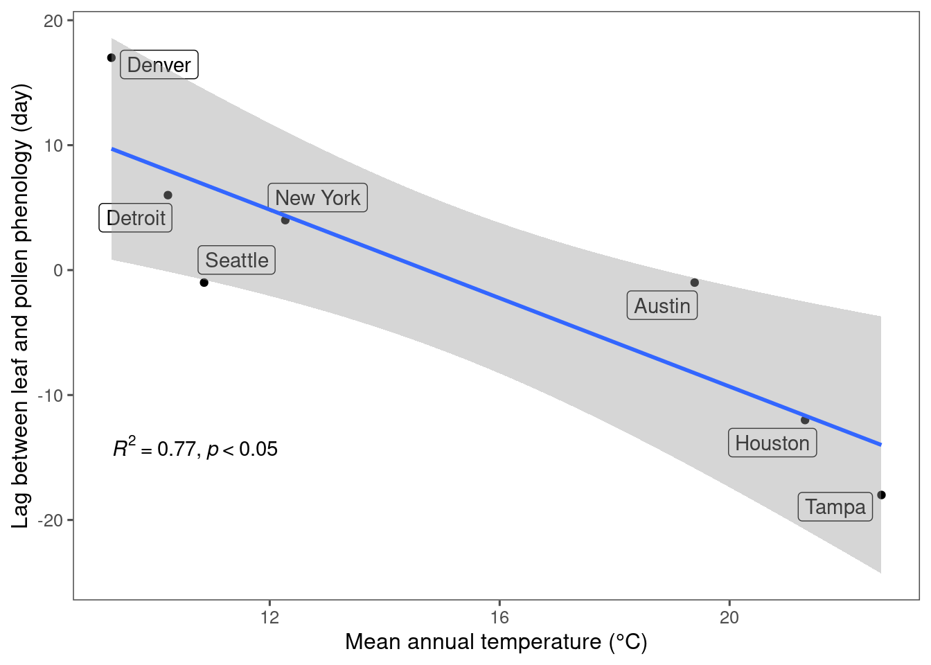 We conducted leave-one-out cross validation to test the robustness of the climate-phenology relationship and the effectiveness of using it to infer flowering phenology in new locations. Specifically, we removed a random city from the pollen dataset at a time, matched leafing and pollen phenology in the other cities, and modeled the climate-lag correlation. We predicted the leafing-phenology lag with the linear model and subsequently predicted the flowering phenology from known leafing phenology at the city held for validation. We evaluated the accuracy of our methods by calculating the RMSE between the predicted flowering phenology and standardized pollen count observations at the cities held for validation.