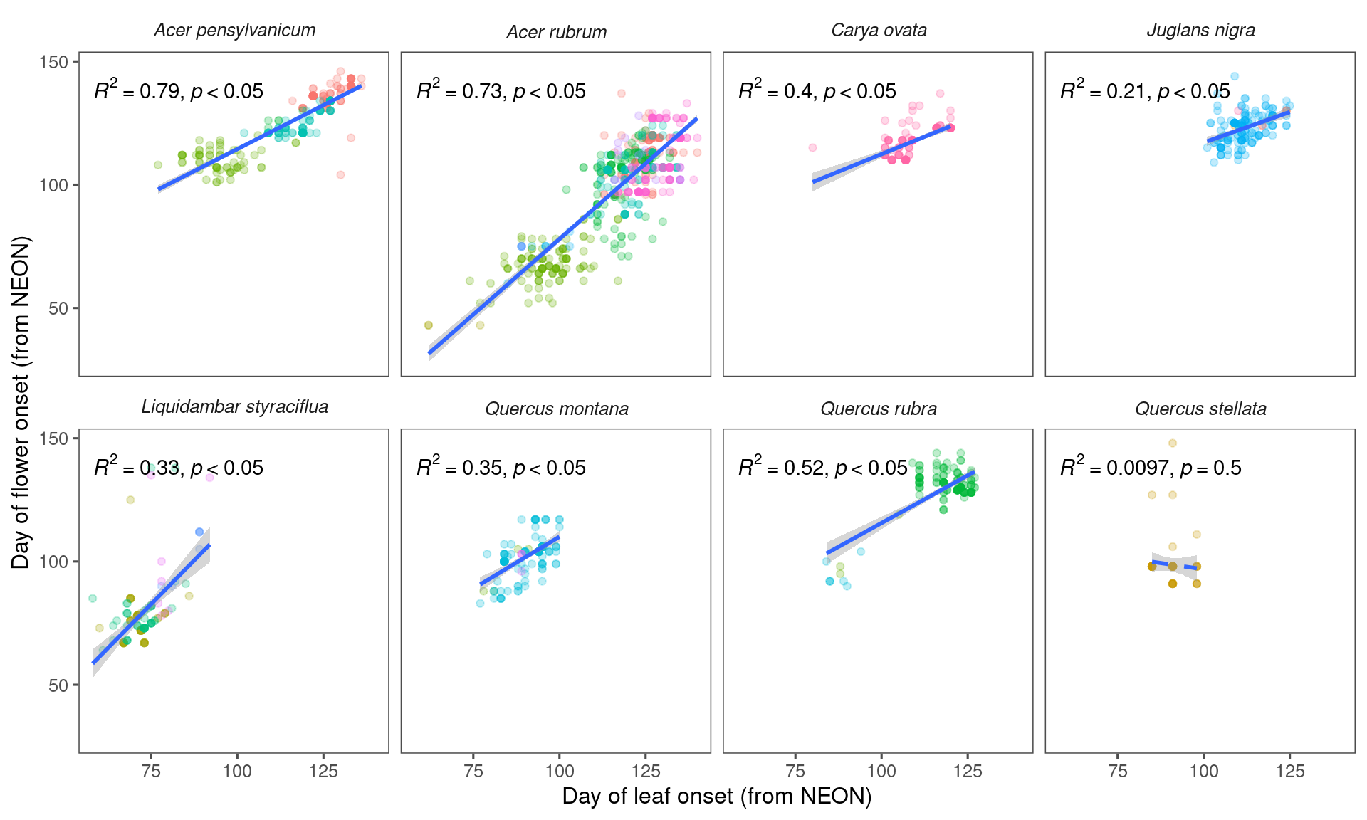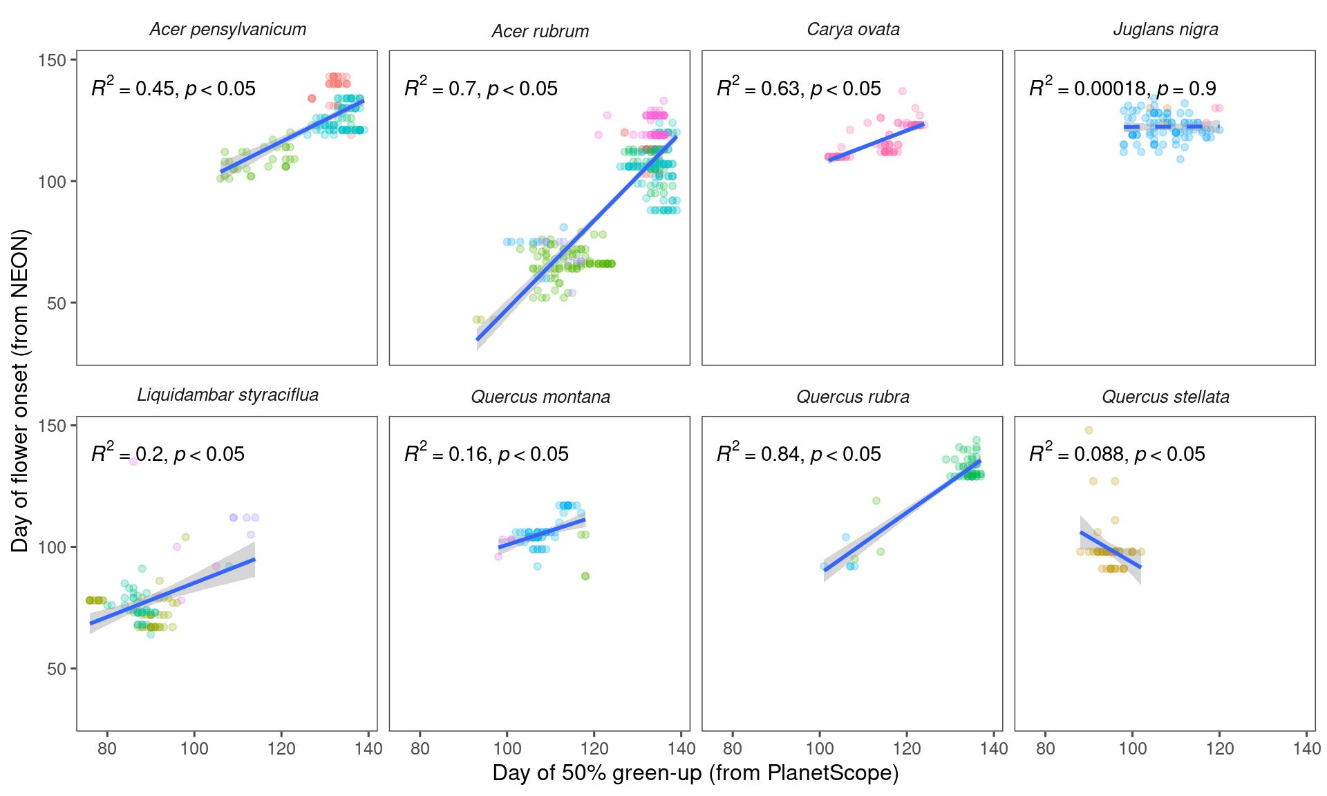 Correlation between 50% green-up time from PlanetScope and flower onset time from NEON.