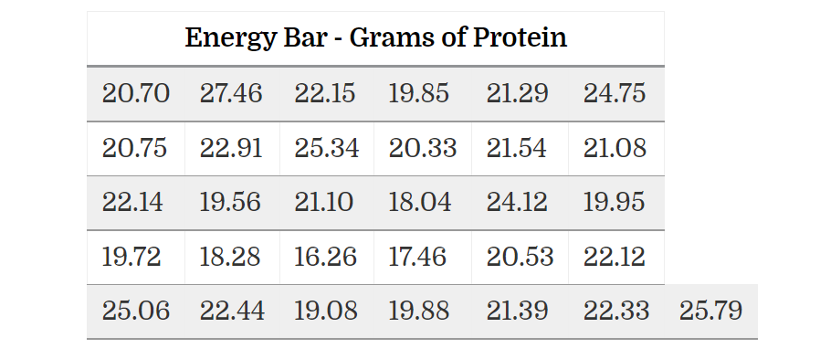 The labels on a particular brand of energy bars claim that each bar contains 20 grams of protein. We have collected a random sample of 31 energy bars from a number of different stores to represent the population of this brand of bars available to the general consumer. The data are listed in the following table