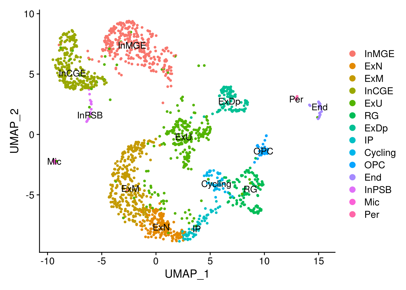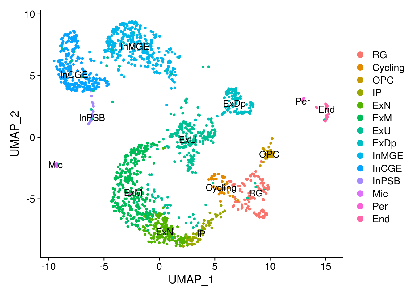 c(RG, OPC, Cycling, IP, ExN, ExM, ExU, ExDp, InMGE, InCGE, InPSB, Mic, Per, End))