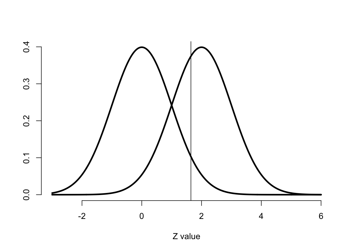 lines(xvals, dnorm(xvals, mean = sqrt(n) * (mu_a - mu_0) / sigma), lwd =3)