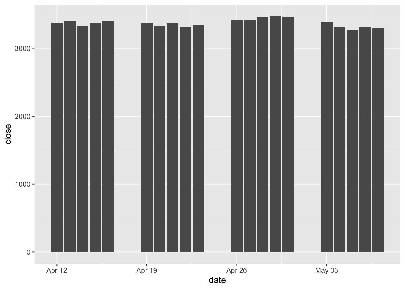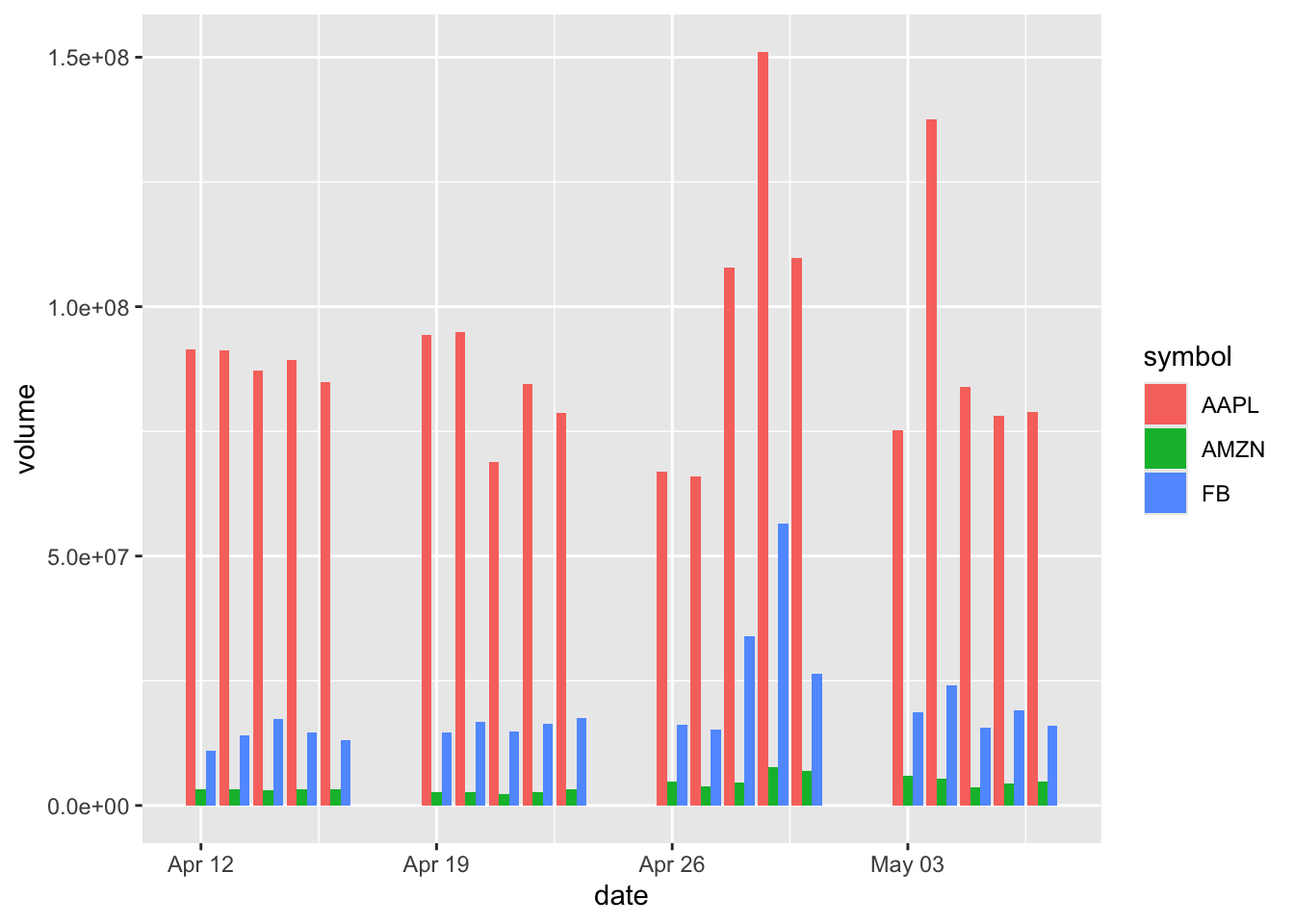 Now we create a new subset where we have Amazon, Apple, and Facebook stocks, and create a new bar chart that groups the data by symbol. Visually the groups will be differentiated by color. That’s what the argument fill does.