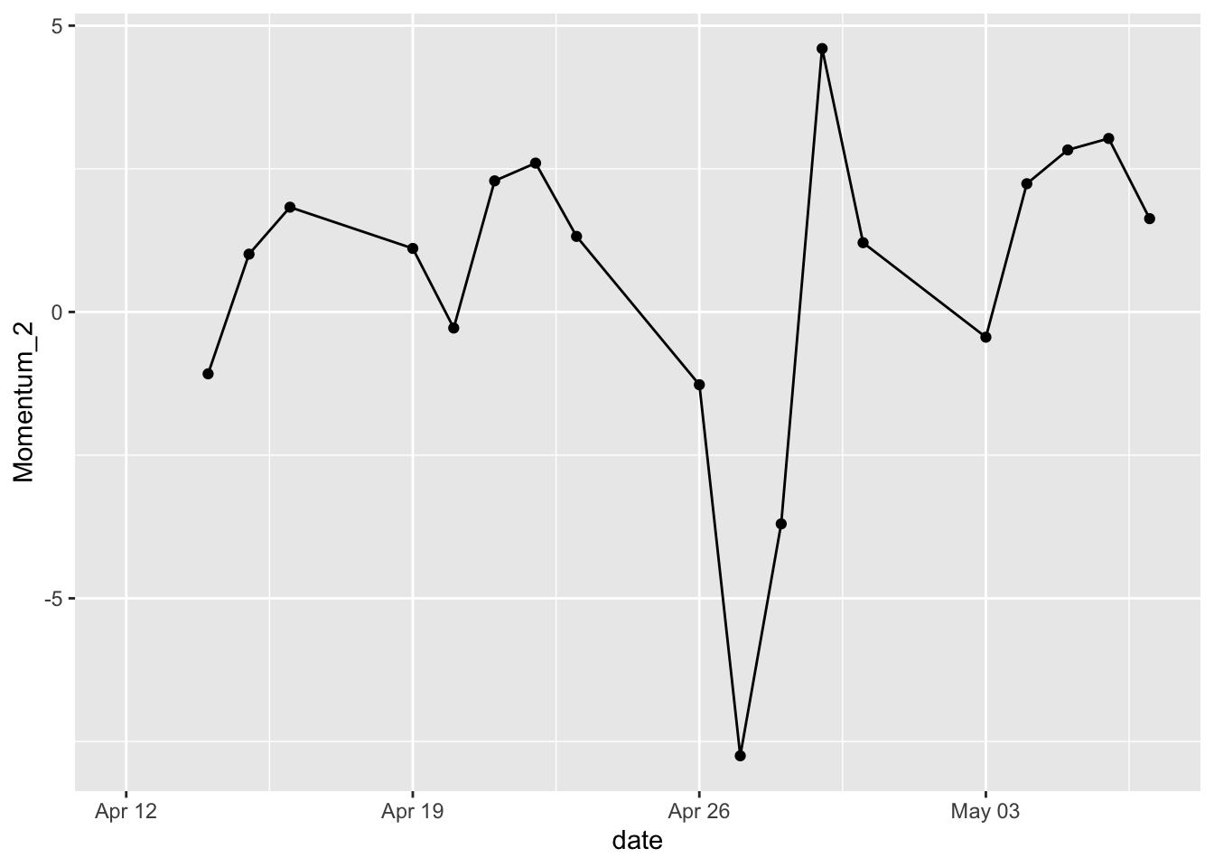 Here we created a new variable two-day momentum Momentum_2, and we work on the subset of the company MMM.