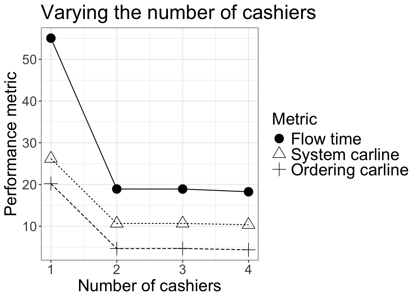labs(title="Varying the number of cashiers",x="Number of cashiers", y = "Performance metric")+