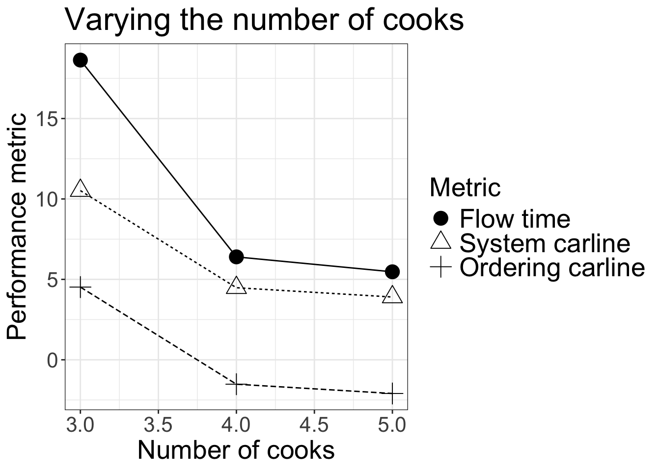 labs(title="Varying the number of cooks",x="Number of cooks", y = "Performance metric")+